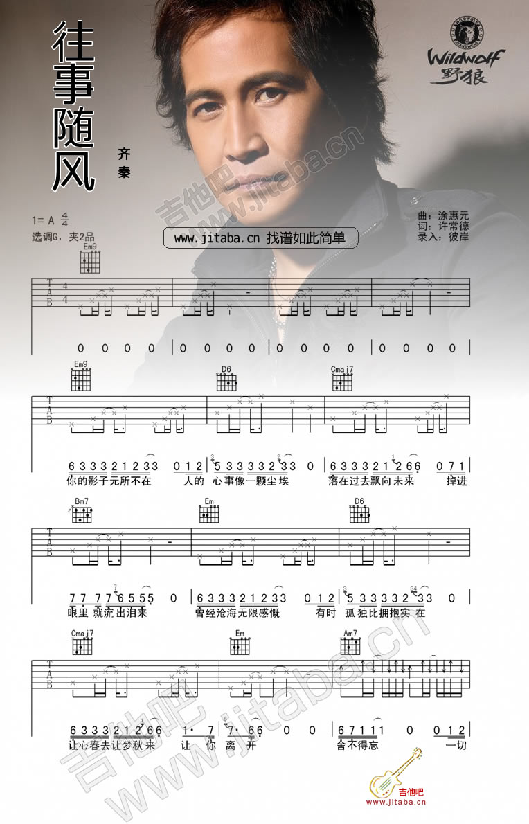 曲谱介绍: 齐秦往事随风吉他谱 六线谱由彼岸吉他编配,往事随风是齐秦的一首代表情歌,歌曲原调A选G调指法,变调夹2品。91吉他谱网站整理提供图片谱分享。
