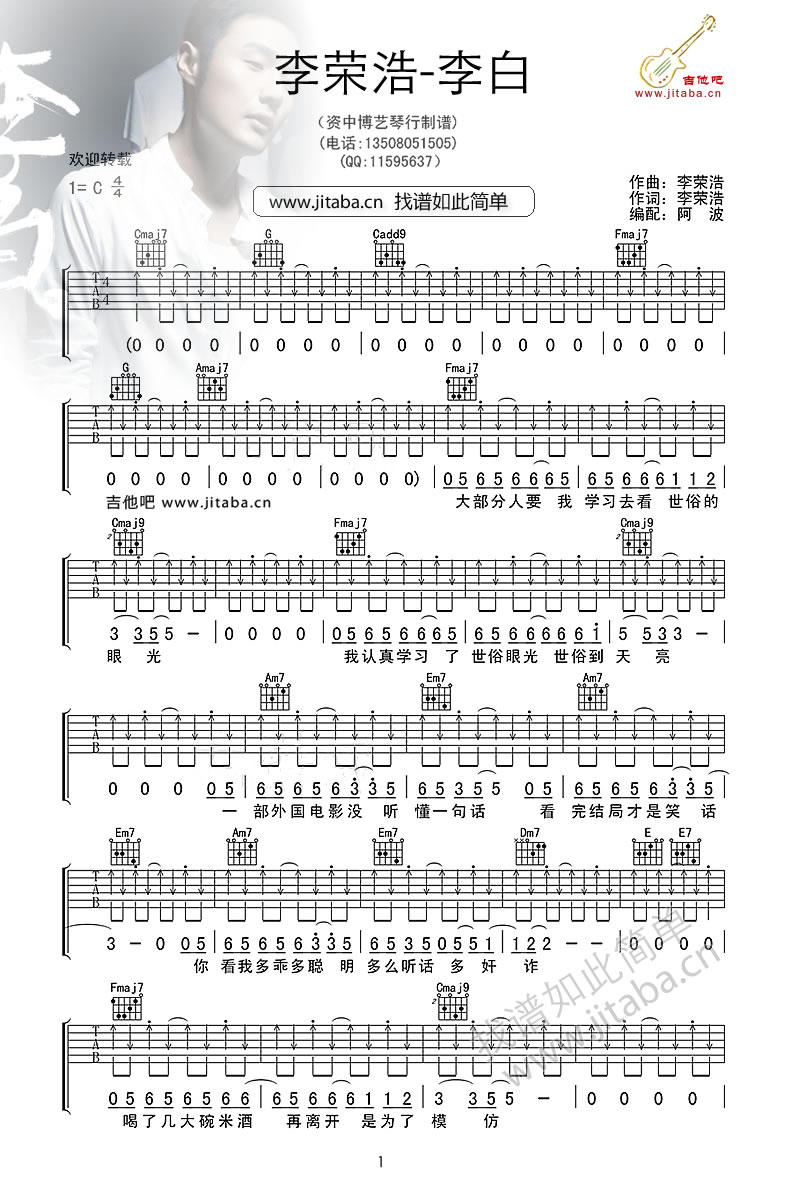 曲谱介绍: 李荣浩李白吉他六线谱,C调指法编配,共三张图片谱例。阿波制谱分享,91吉他谱网站整理。李白是一首个性十足的原创歌曲。在湖南卫视《我是歌手》第三季第一位踢馆歌手,金曲奖新人李荣浩给人印象深刻。李白吉他谱,李荣浩吉他弹唱歌曲,91吉他谱为喜欢的琴友们转发收藏。
