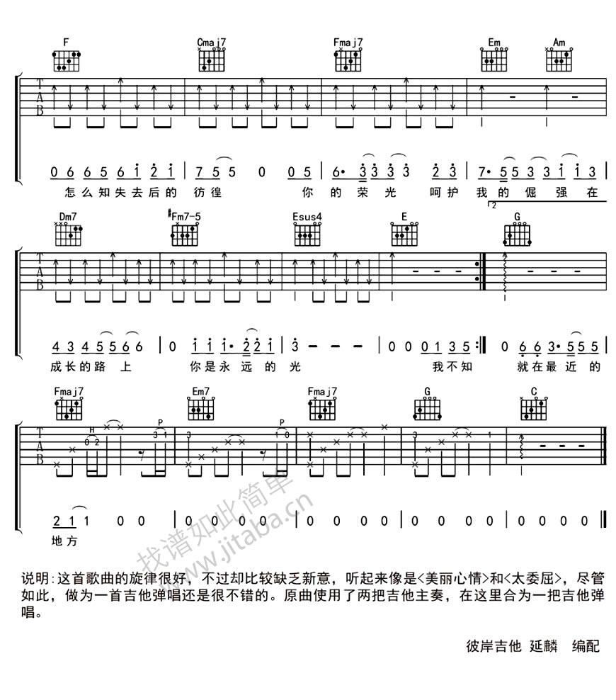 曲谱介绍: 王筝天使的城吉他谱,同名电视剧《天使的城》主题曲,唱出面对成长路上坎坷的一种不屈,旋律优美,沁人心脾。旋律很好适合吉他弹唱,原曲用了两把吉他,这里编配时合成一把吉他弹唱。王筝歌曲吉他弹唱谱分享。