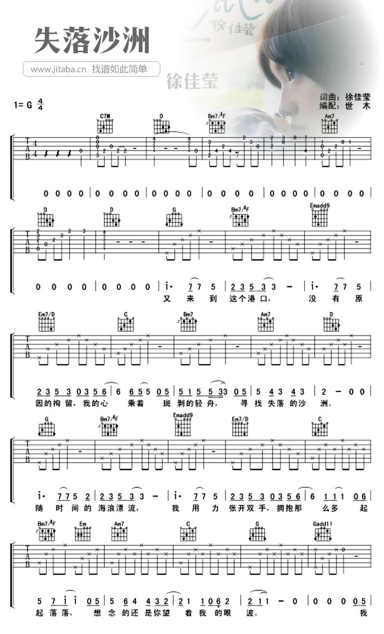 曲谱介绍: 徐佳莹失落沙洲吉他谱,六线谱编配,只用一把吉他伴奏的失落沙洲,词曲演唱都禁得起仔细聆听的考验,失落沙洲吉他弹唱谱,共四张图片。