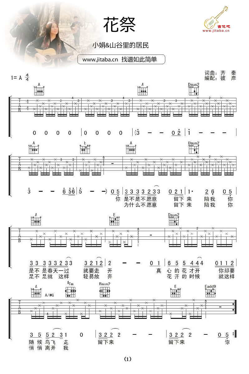 曲谱介绍: 小娟和山谷里的居民演唱的花祭吉他谱。听完齐秦的《花祭》,再听小娟的版本。前者适合青春年少,太多的无奈挣扎,后者则是云淡风轻,似乎在说着别人的故事,适合现在的年纪。或许我们都该感谢那些曾经的心痛与纠结,才能遇到如今温暖慈悲的自己。91吉他谱网站,经典老歌吉他弹唱谱分享。