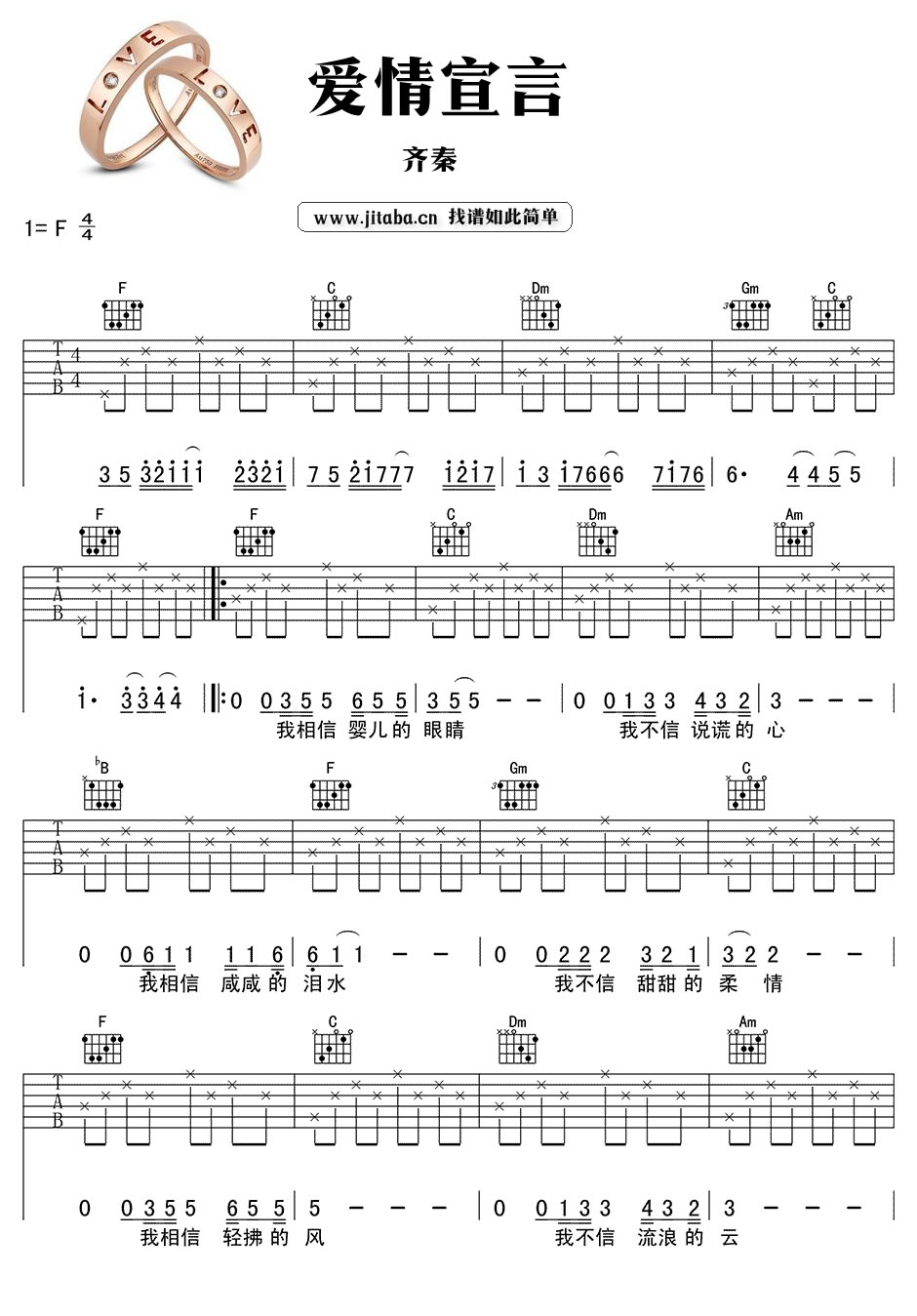 曲谱介绍: 齐秦爱情宣言吉他谱,F调指法,高清图片谱编配。爱情宣言六线谱,芸芸众生中,谁错过了谁,谁又坚持到最后,经历过那个时代,代表一种情感。歌声和旋律是一种情感的回忆,只要听到,就能想起,齐秦的经典老歌《爱情宣言》,吉他弹唱谱分享。