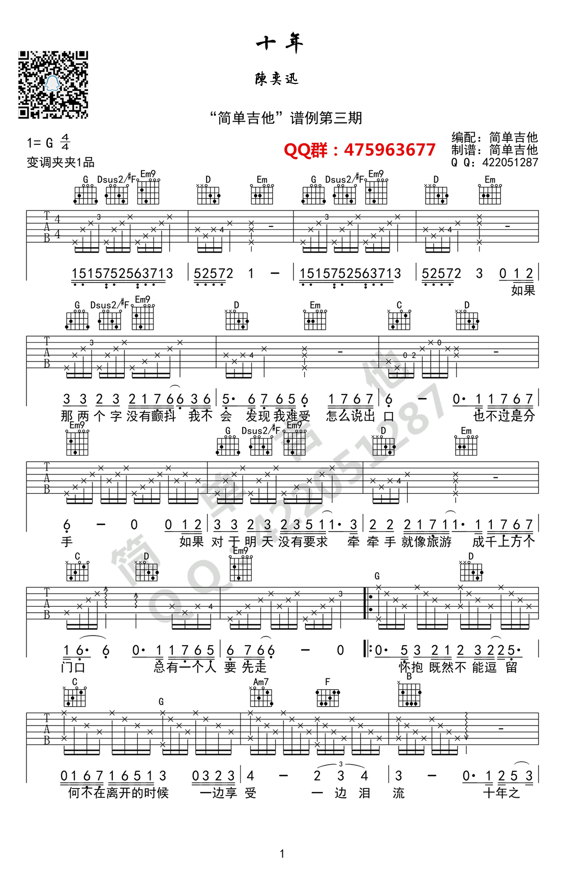 曲谱介绍: 陈奕迅十年吉他谱,G调指法,变调夹夹一品,简单吉他编配制谱。十年吉他弹唱谱,高清图片谱。人生有多少个十年,人生又有多少个路过与相遇,过去听陈奕迅的《十年》,心中无波无澜,嘴上也能轻易地唱出。那是因为年轻的生命里没有所谓十年之人。如今才越觉得十年苦涩难唱。一首《十年》唱出了多少人的无奈和欲语泪先流!