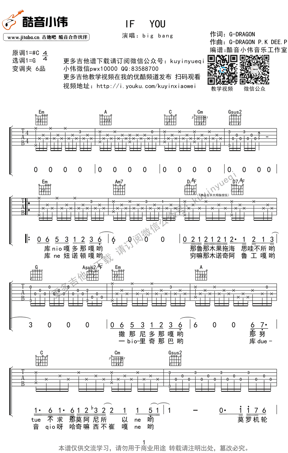 曲谱介绍: Bigbang if you吉他谱,原调#C调,选调G,变调夹夹六品。超原版好弹的IF YOU吉他六线谱,三张图片谱高清版,配中文音译歌词,感谢酷音小伟音乐工作室编谱。