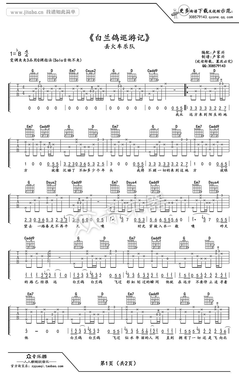 曲谱介绍: 丢火车乐队白兰鸽巡游记吉他谱,原调bB,变调夹夹三品,用G调指法,其中SOLO吉他不夹。白兰鸽巡游记吉他六线谱,高清图片谱,感谢卢家兴编配制谱分享。当吉他的弦音拨响,就仿佛我们开始乘着歌声的翅膀,在漫漫的人生旅途中,去追寻光明、自由和希望。那悠远的畅想,动情的神往,带着我们飞跃了广袤世界,回到心中的远方。