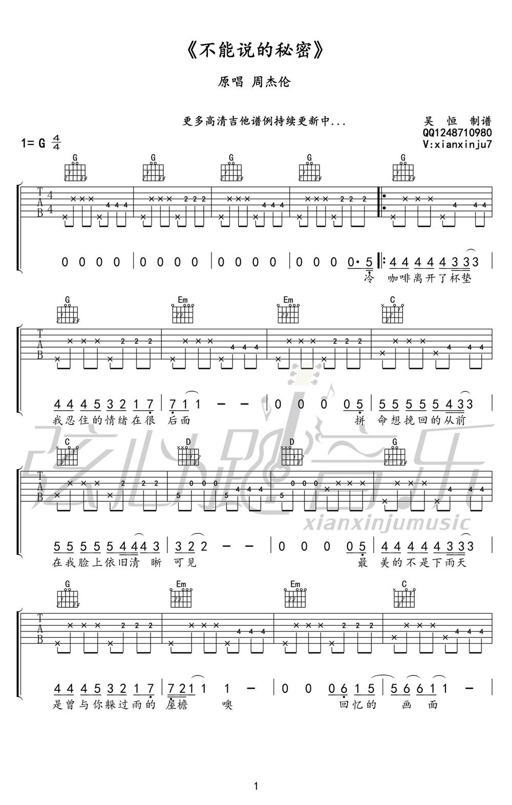 不能说的秘密吉他谱 - 周杰伦 - G调吉他弹唱谱