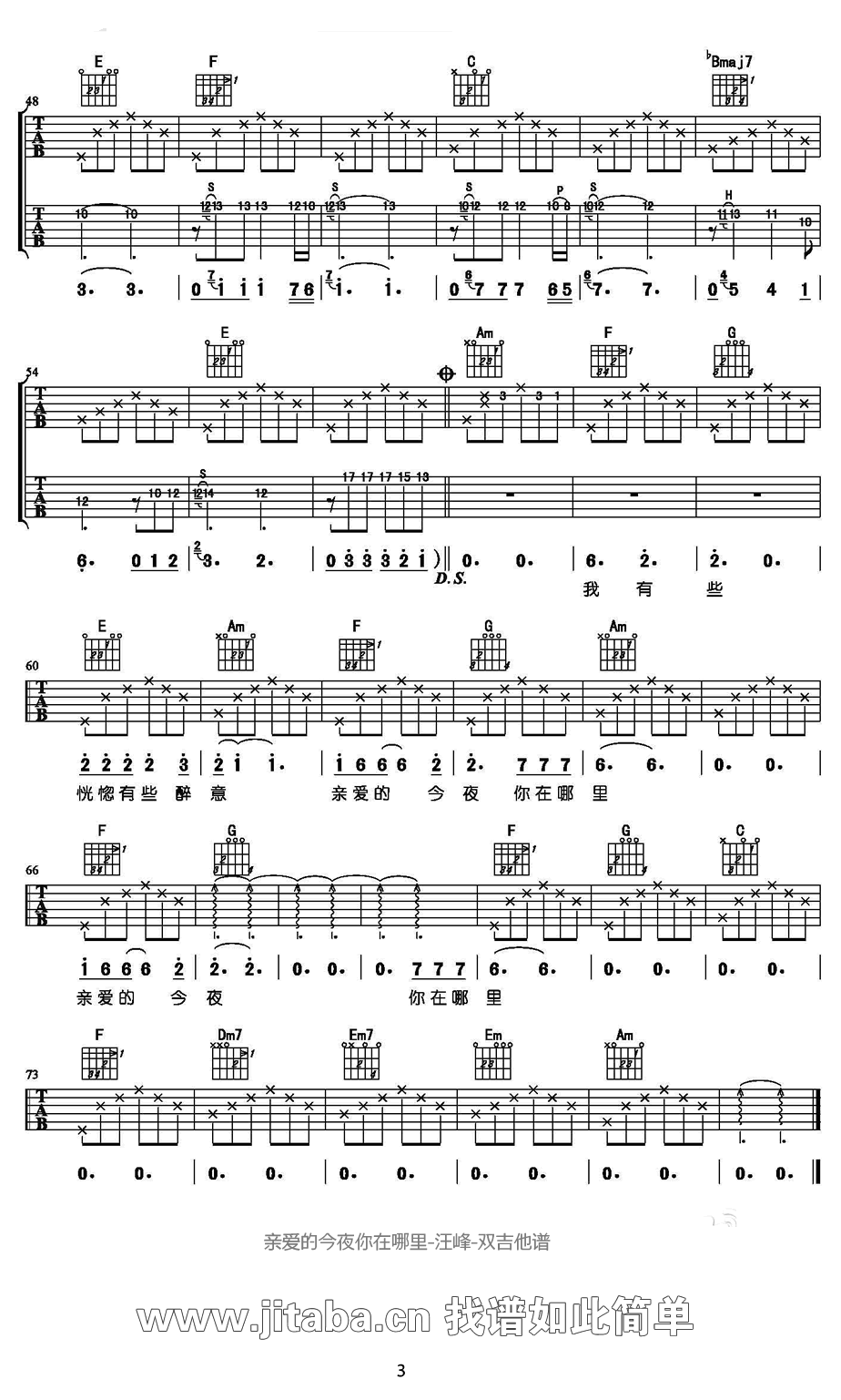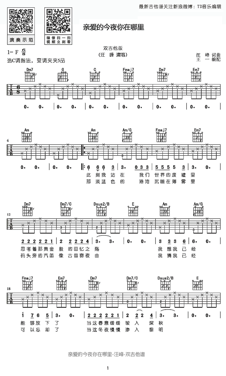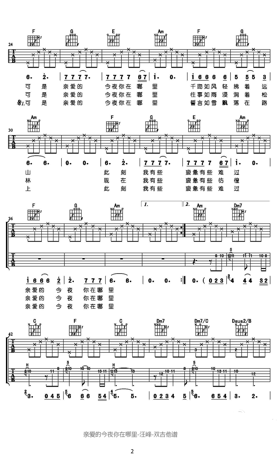 曲谱介绍: 汪峰 亲爱的今夜你在哪里吉他谱,双吉他版本,原调F选C调指法,变调夹夹5品,一首无比动人和优美的歌曲,汪峰新专辑《河流》曲目,亲爱的今夜你在哪里吉他六线谱,随曲谱附上弹唱教学示范,感谢王一编配讲解。