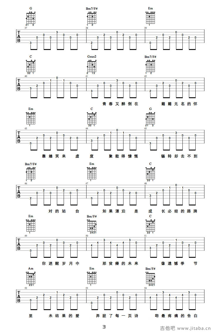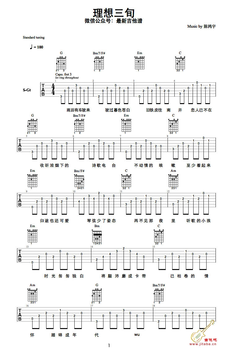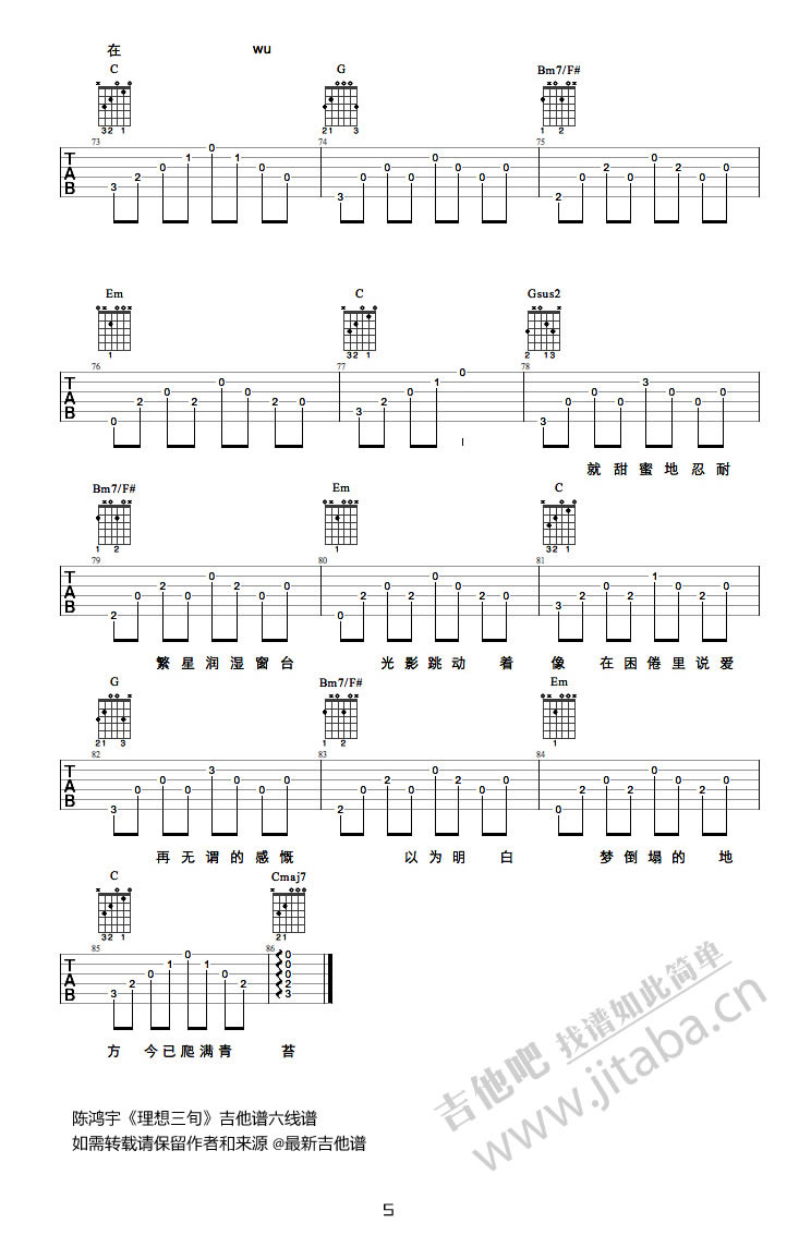 曲谱介绍: 陈鸿宇理想三旬吉他谱,六线谱完整版编配,五张图片谱例,理想三旬吉他弹唱谱,陈鸿宇原创歌曲,收录在他还在创作和众筹的专辑《浓烟下的诗歌电台》中,词作者是唐映枫。《理想三旬》歌词写得很隐晦,字面上看有点《兰亭集序》想表达的那种时光易逝青春不再理想老去的意思。但是最后的爬满青苔,我情愿将时间真的过去很久了硬是理解成病树前头万木春。我希望是这样。人总有希望的未来。民谣会上瘾,安静随意中会不经意间被某个旋律、某句歌词击中内心最柔软的地方。