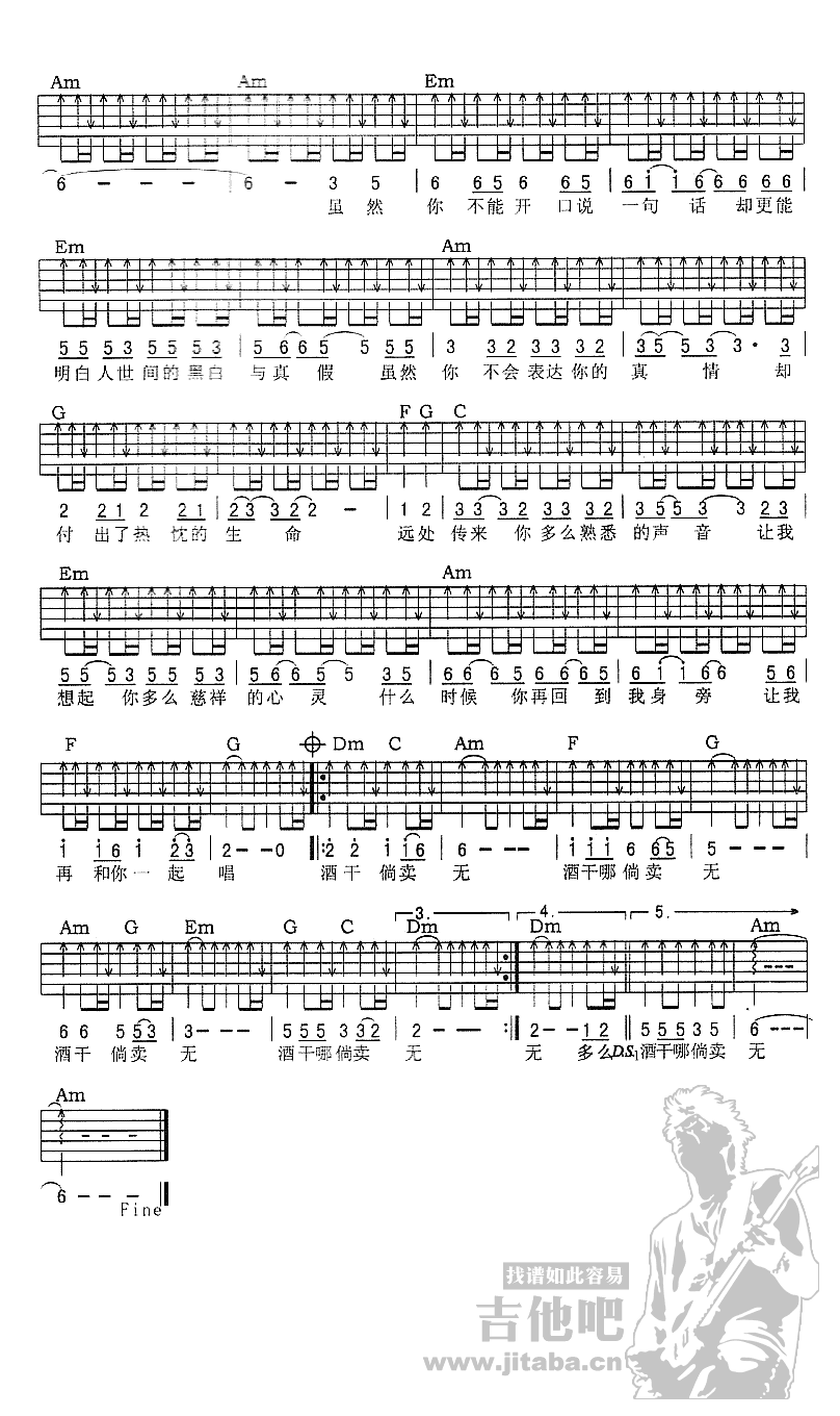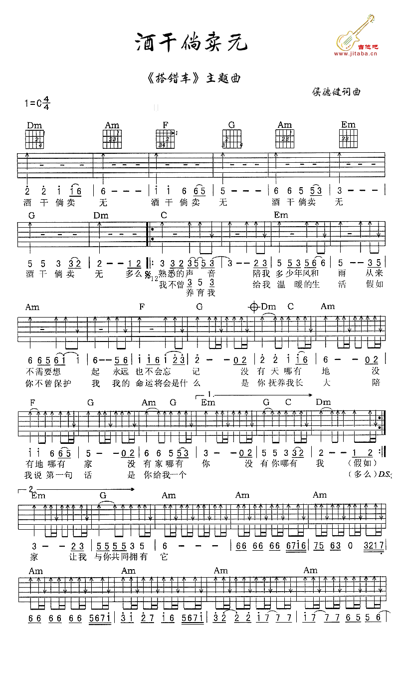 曲谱介绍: 电影《搭错车》主题曲,苏芮原唱,酒干倘卖无吉他谱,C调六线谱。侯德健词曲的一首《酒干倘卖无》曾经在祖国大陆大街小巷传唱。一部《搭错车》表达了无法言语的父爱,一首《酒干倘卖无》唱出多少人的泪水,酒干倘卖无吉他弹唱谱,经典老歌唱出最质朴的大爱情怀。