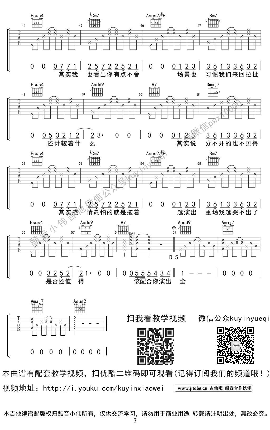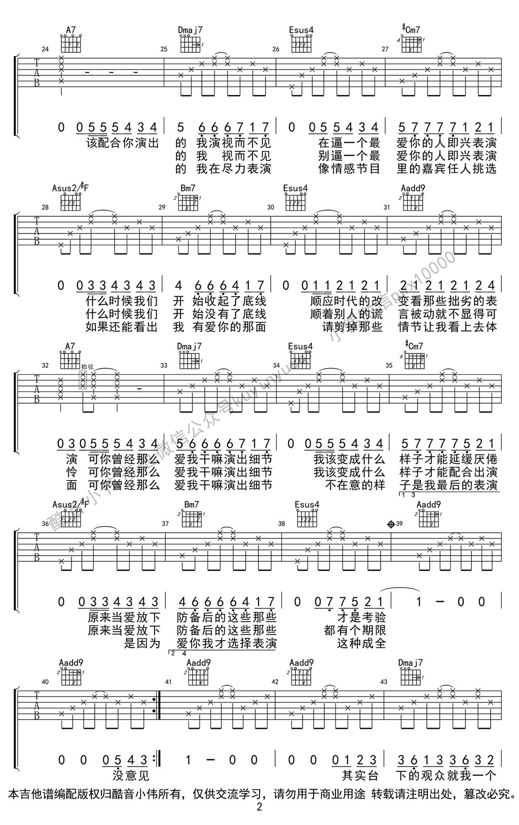 曲谱介绍: 演员吉他六线谱,薛之谦演员吉他谱,原调B选调A,变调夹夹第二品。感谢小伟编配,倩倩制谱。演员吉他弹唱视频教学,本调式为接近原版改编,如果琴友们需要学习简单版,可以关注推出的C调编配《演员》吉他谱。我们都像演员,在每个圜转之间演绎谎言,明明心绪澎湃还要故作忍耐,演好每一次的曲终人散;流转低回而动人的旋律,忧伤的唱出一段情感的分手结局。