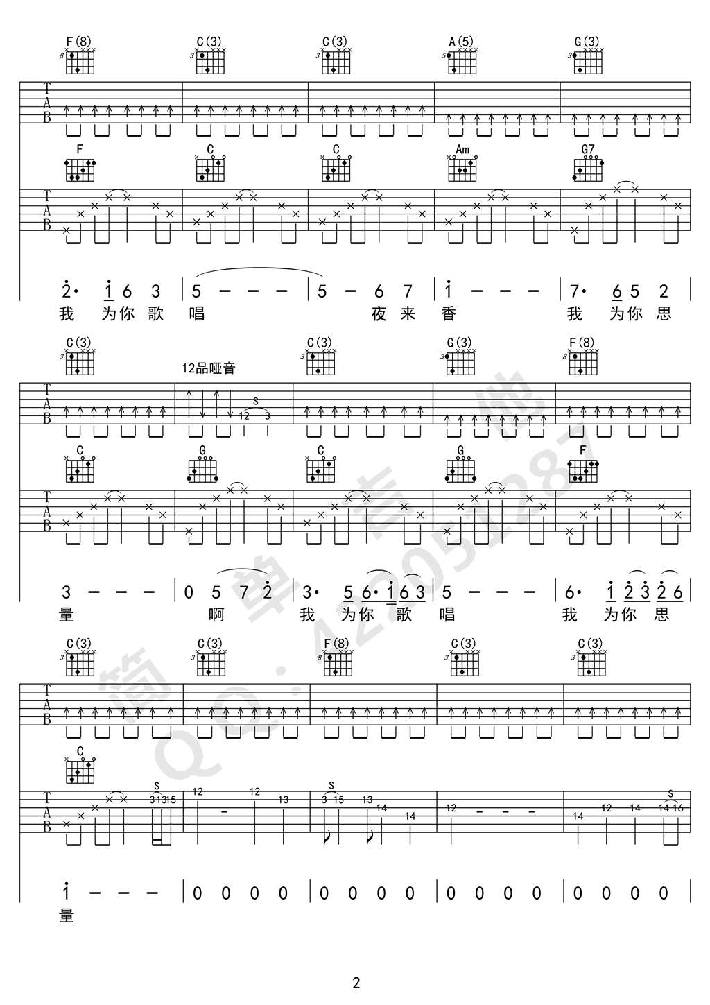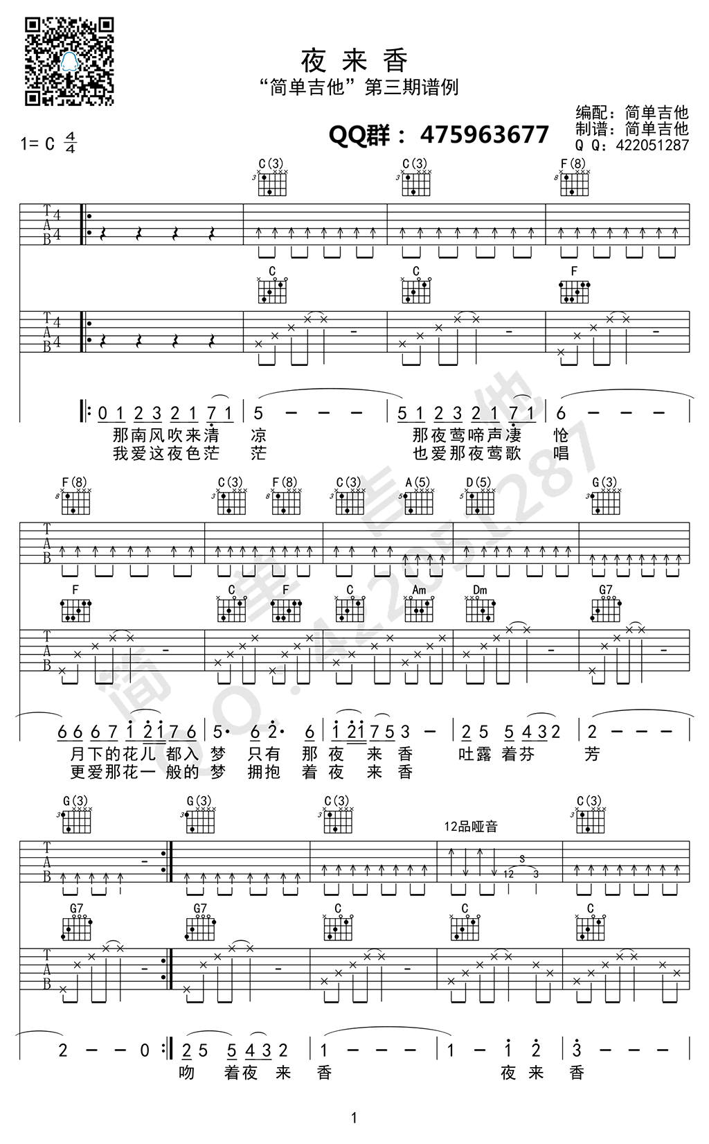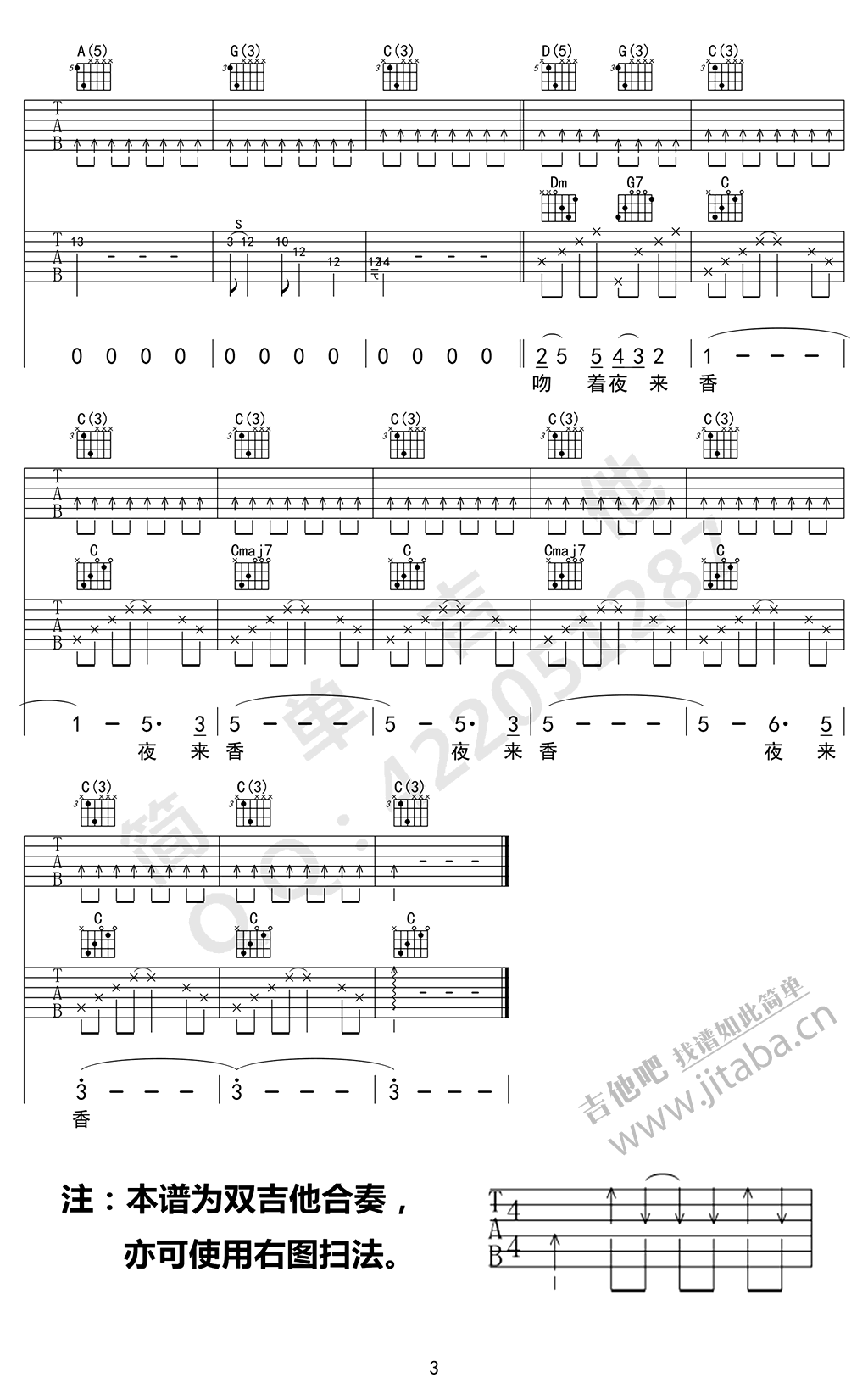 曲谱介绍: 邓丽君夜来香吉他谱,C调指法简单吉他编配,夜来香吉他六线谱,曲谱为双吉他合奏版本,也可使用图片谱底部注释的扫法。经典的怀旧老歌,细腻悠扬的旋律,温婉甜美的歌声,穿越了时空的界限,带我们重温记忆中最美好的时刻。
