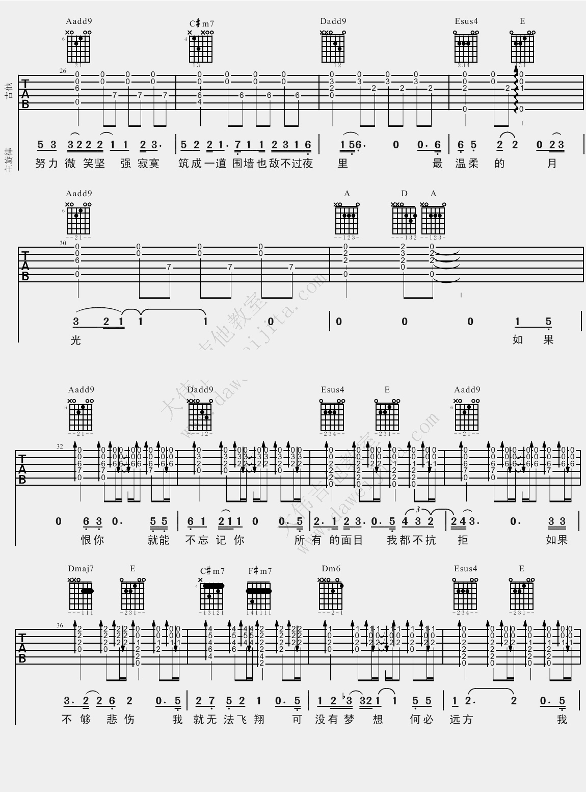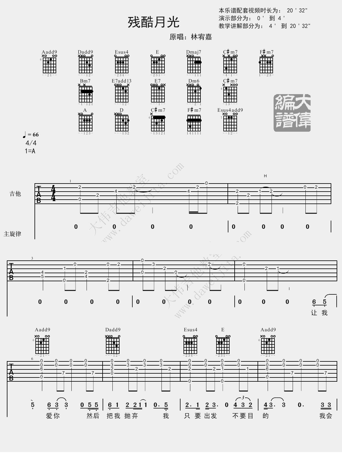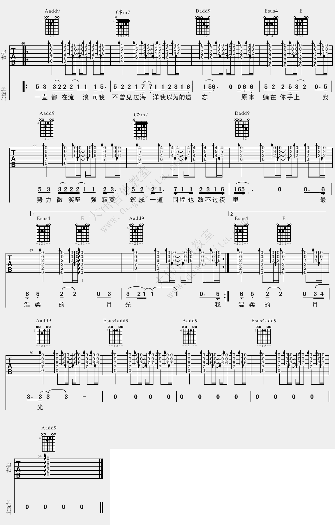 曲谱介绍: 林宥嘉残酷月光吉他谱,A调编配,根据原曲风格改编,六线谱高清版图片谱,间奏部分不适合民谣吉他演奏,所以做了省略,感谢大伟吉他教室编配分享。随谱附上残酷月光吉他弹唱教学视频,残酷月光吉他谱,缓和优雅的旋律优美低沉,格外触动心弦,温柔低喃唯美的声音唱出和哀而不伤的感情,有时候最美好的事,就是深夜时分一个人望着倾泻而下的月光,想着你。