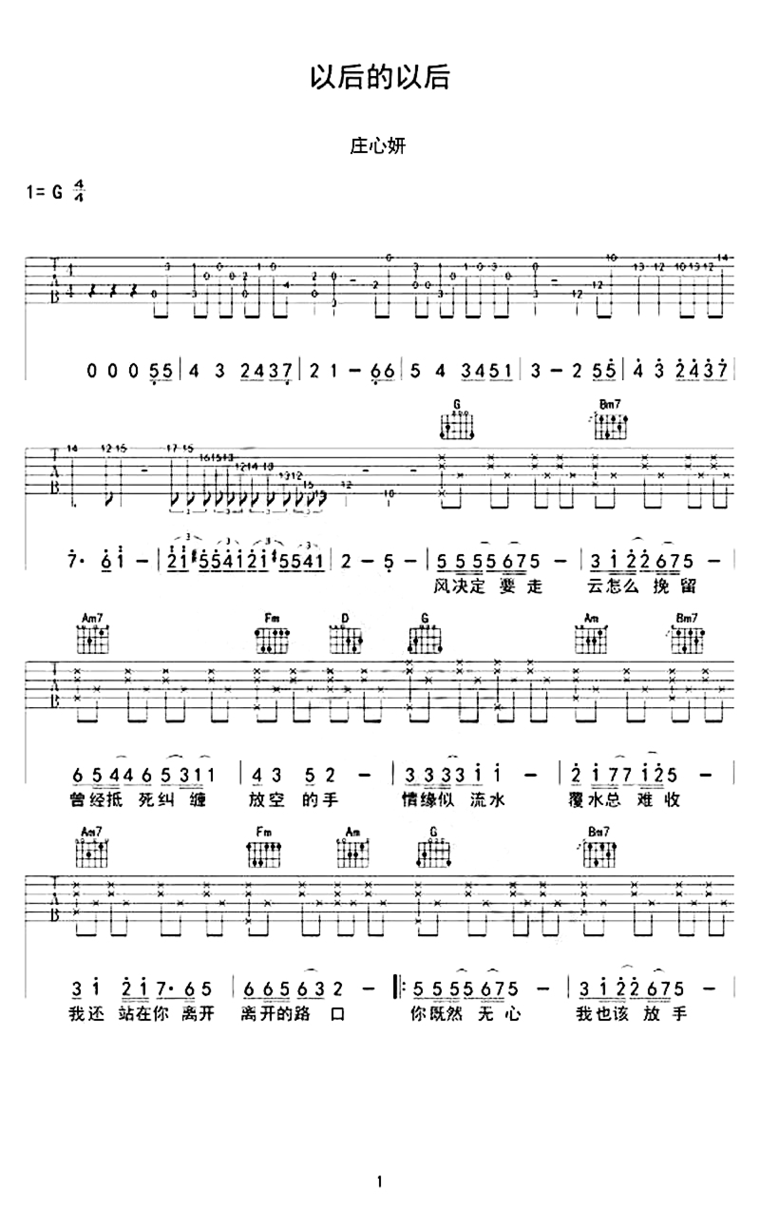 曲谱介绍: 庄心妍《以后的以后》吉他谱,G调指法。喜欢庄心妍的声音,旋律简单,歌词通俗,贴近人心。同时,深深的明白我们一生都在得到与失去的边缘徘徊,不断地向过去和现在挥手告别,别无选择的步入以后,割舍着,哭着笑着就长大了,哪怕嘴角还有泪滴依然心怀感激。