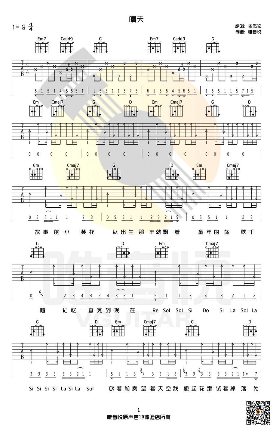 周杰伦 晴天吉他谱 - 周杰伦 - G调吉他弹唱谱