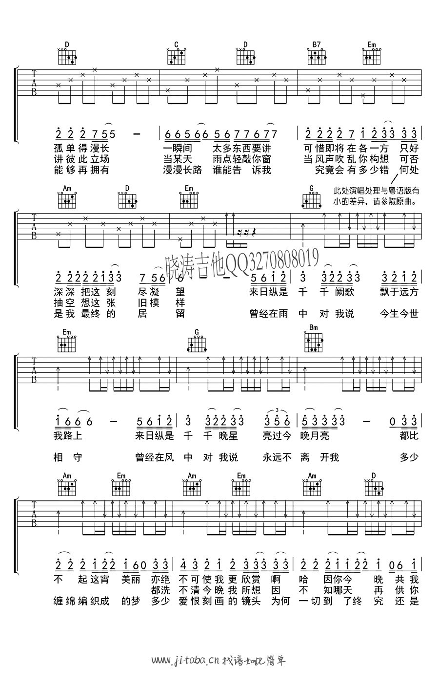 曲谱介绍: 千千阙歌吉他谱,六线谱格式,图片谱高清版,配上了粤语和国语歌词。《千千阙歌》这首歌讲的是离别时的不舍,粤语陈慧娴的原唱,国语版是李翊君演唱,曾谓《千千阙歌》唱出哀伤的漂亮,并在离别之际为人间留下了最美丽动人的一幕。固是芳馨悱恻,固是沉挚凄艳。幽眇情深,执著至死,然终是长宵欲曙、蜡泪啼红。阻不住的消逝,不自持的怅惘。凄美的背后,实存寓着万不得已的沉痛与悲哀。至美的背后,究是至悲。