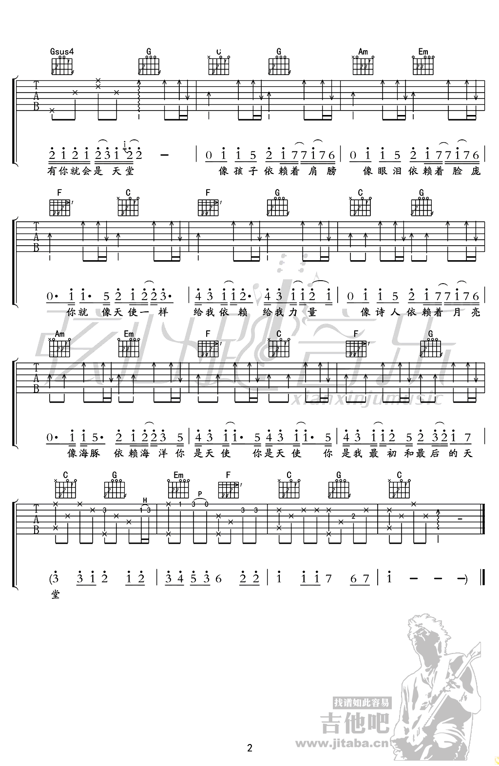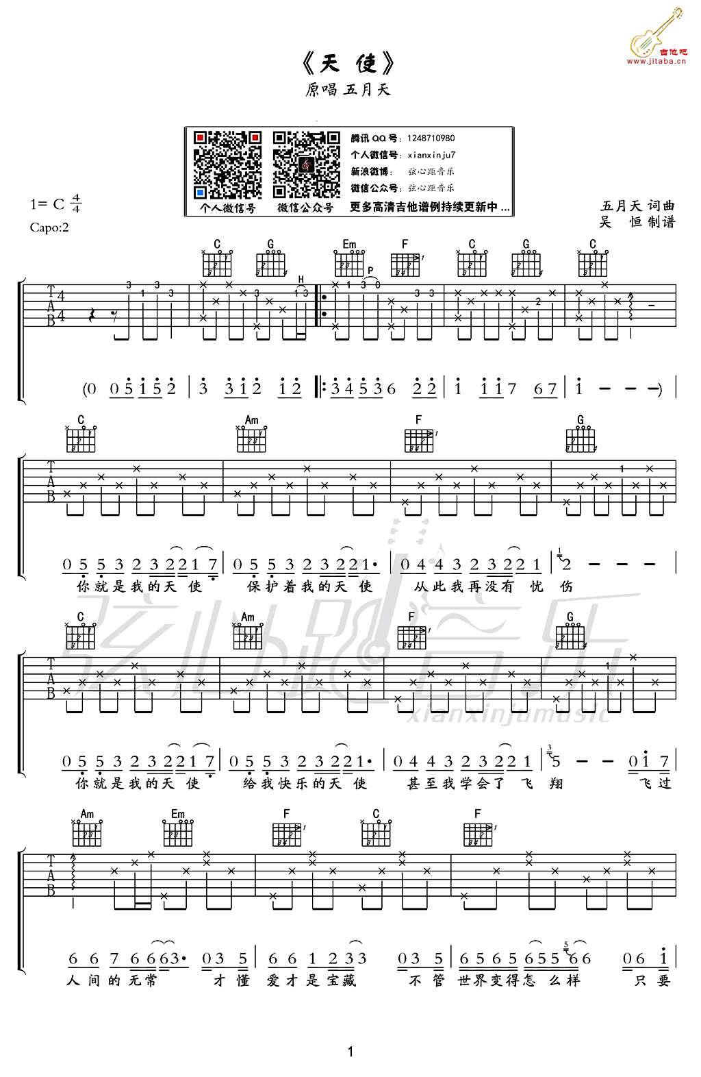 曲谱介绍: 五月天天使吉他谱,C调指法编配,Capo夹二品,天使吉他六线谱,图片谱高清版,感谢吴恒制谱,五月天的一首好听的歌,温暖治愈的旋律,乘载着我们的青春梦想,希望琴友们永远都能坚守心中的小小天使。