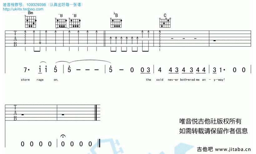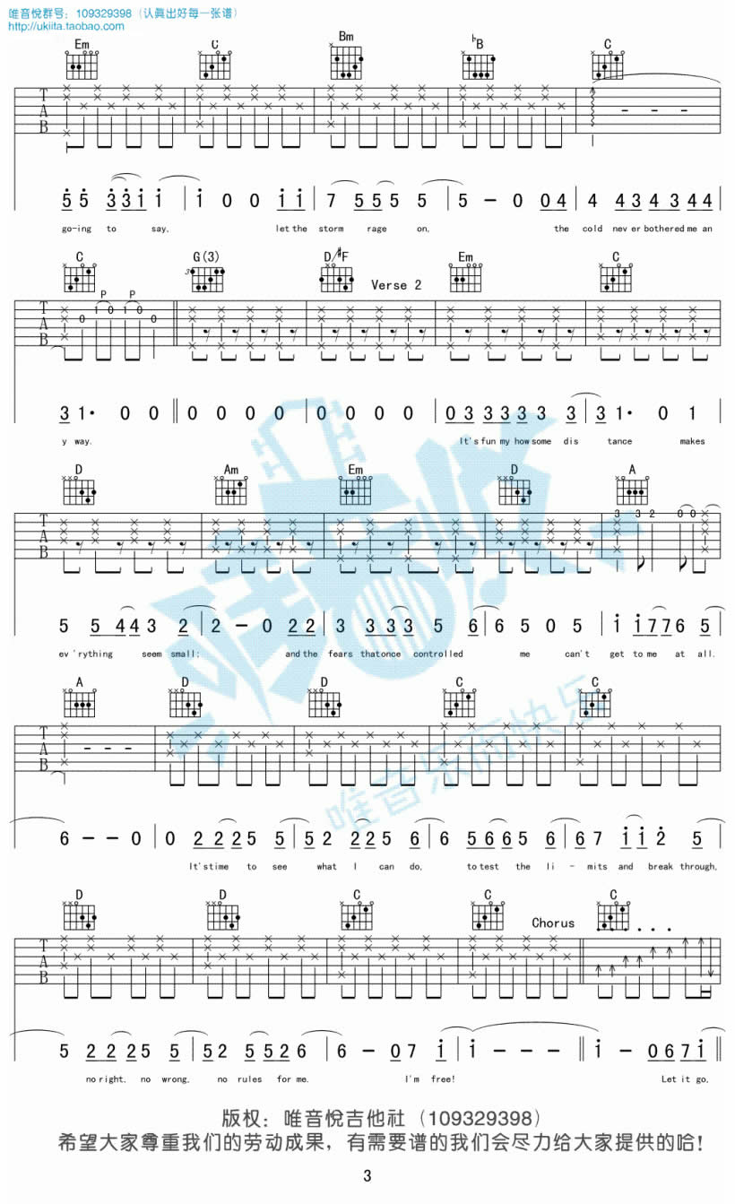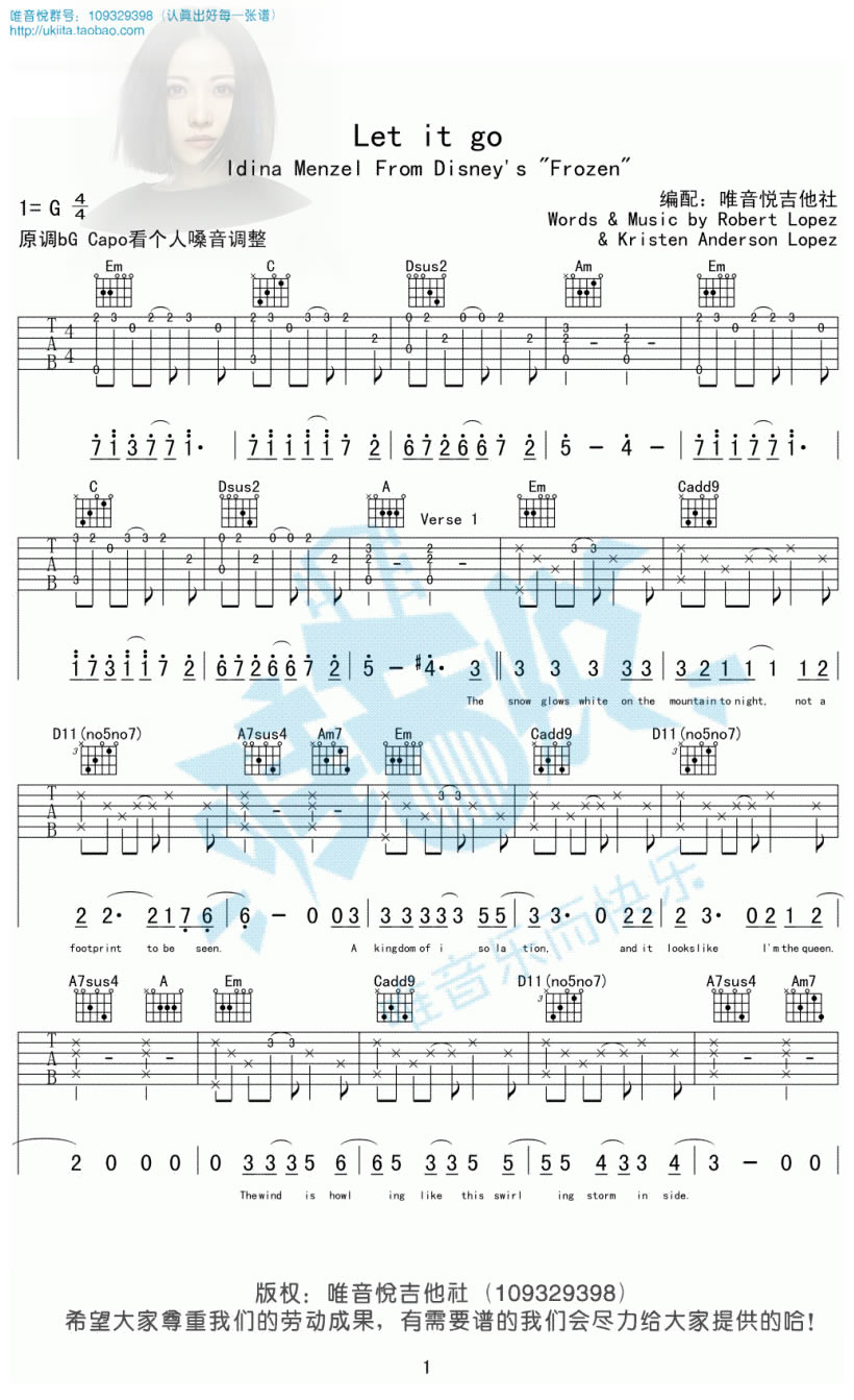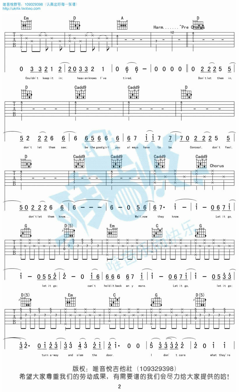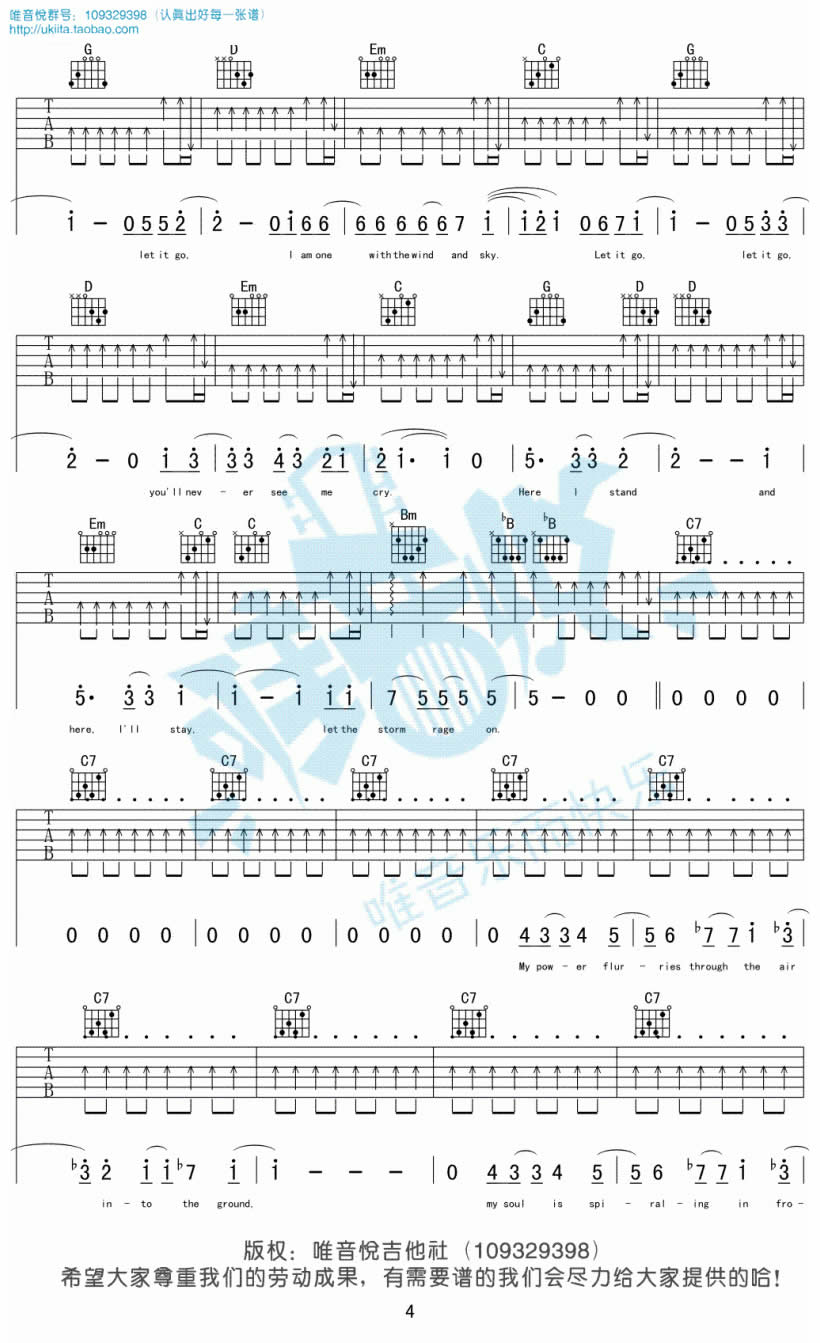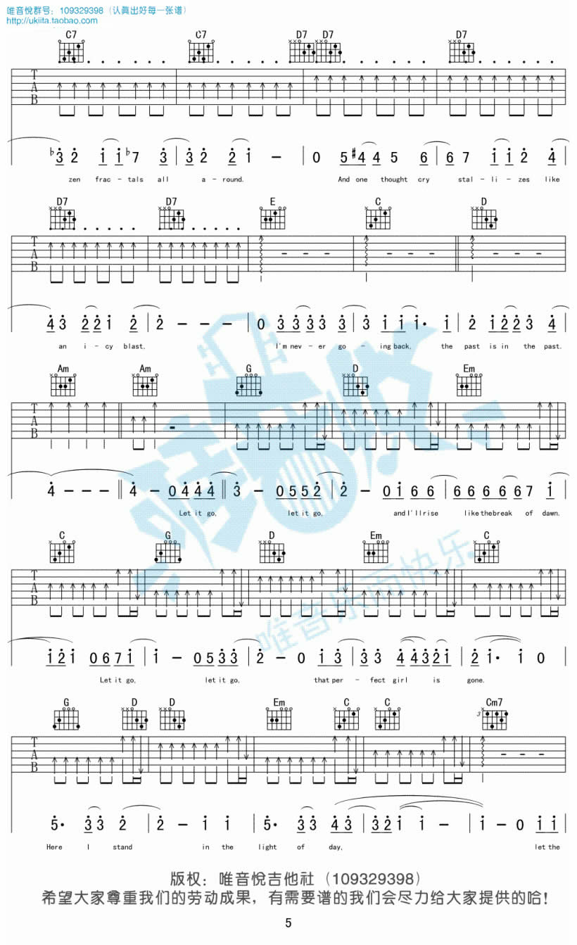 曲谱介绍: let it go吉他谱,完整版编配,共六张图片谱。随它吧吉他弹唱谱,动画电影《冰雪奇缘》的主题曲。let it go吉他六线谱,原调bG,变调夹根据个人嗓音调整。