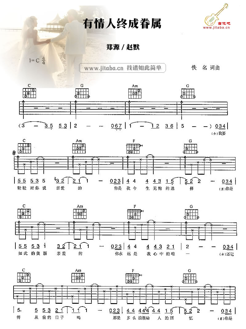 曲谱介绍: 郑源有情人终成眷属吉他谱,C调指法编配,郑源和赵默演唱的一首男女对唱情歌。有情人终成眷属吉他弹唱谱,图片谱三张。用最深情的祝愿来祝福最美好的爱情,愿天下有情人终成眷属。