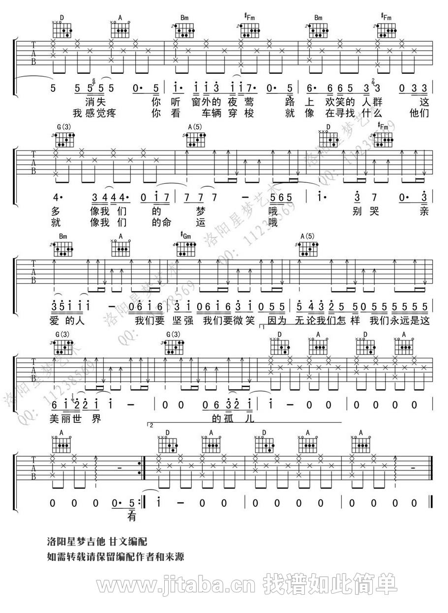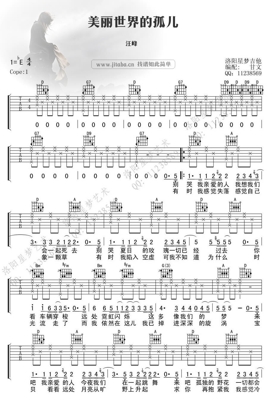 曲谱介绍: 汪峰美丽世界的孤儿吉他六线谱,图片谱格式,原调降E,变调夹capo夹一品。