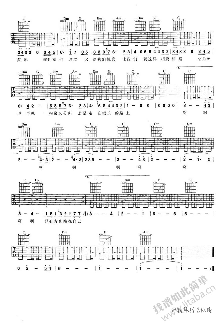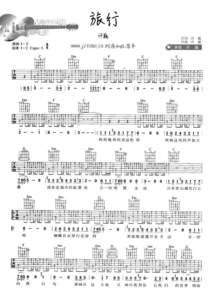 曲谱介绍: 许巍旅行吉他谱,原调F选调C,变调夹夹5品。旅行吉他弹唱谱,六线谱图片,最易上手版本编配。每次吉他弹唱起这首《旅行》,都会不由自主的陶醉在这个旋律之中。已经习惯了在安静的夜、旅途的路上和一个人安逸的时光里倾听许巍,音乐与旅行为伴,什么现实世界爱恨离别,都已不那么重要了。。