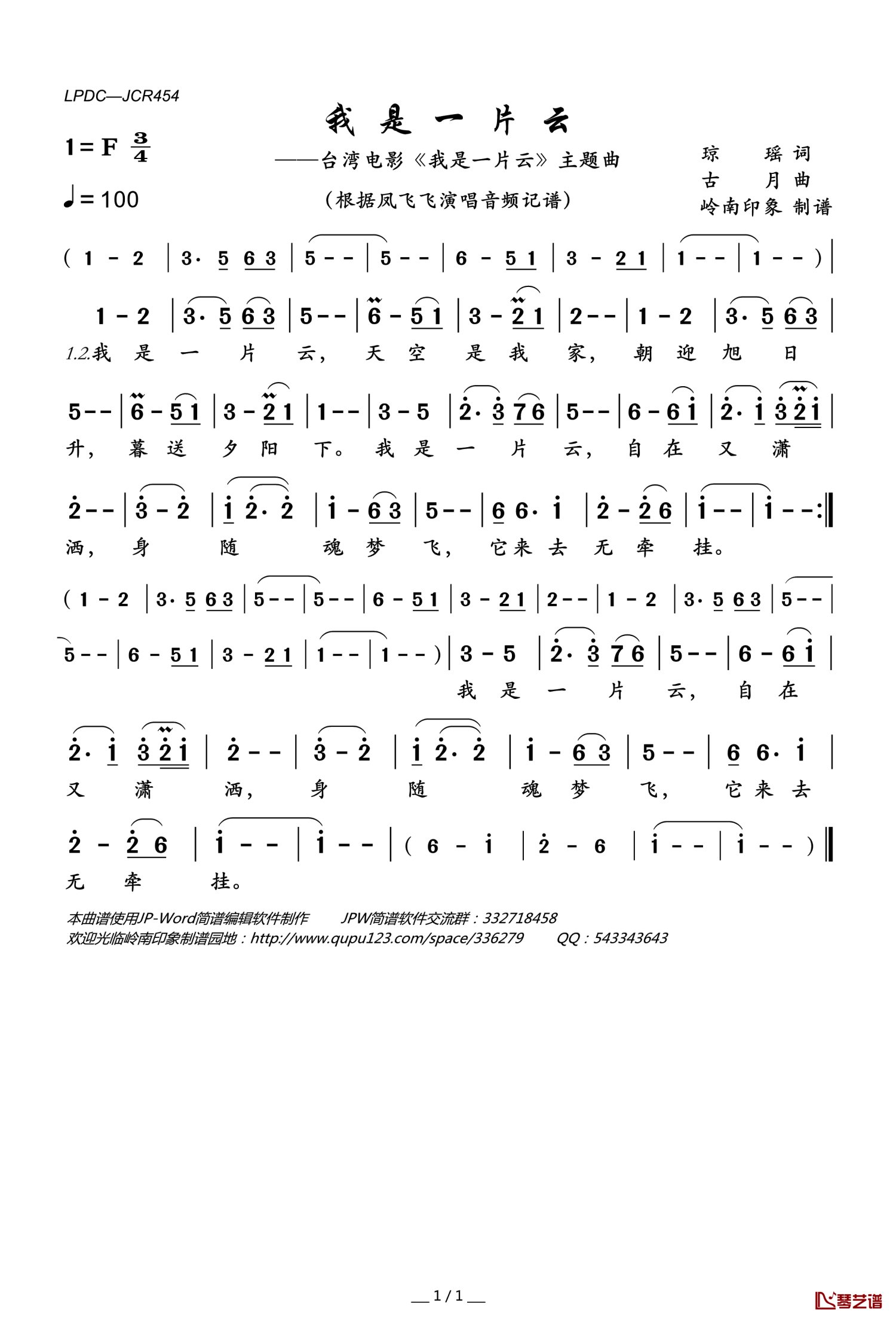 曲谱介绍: 凤飞飞《我是一片云》歌词_简谱