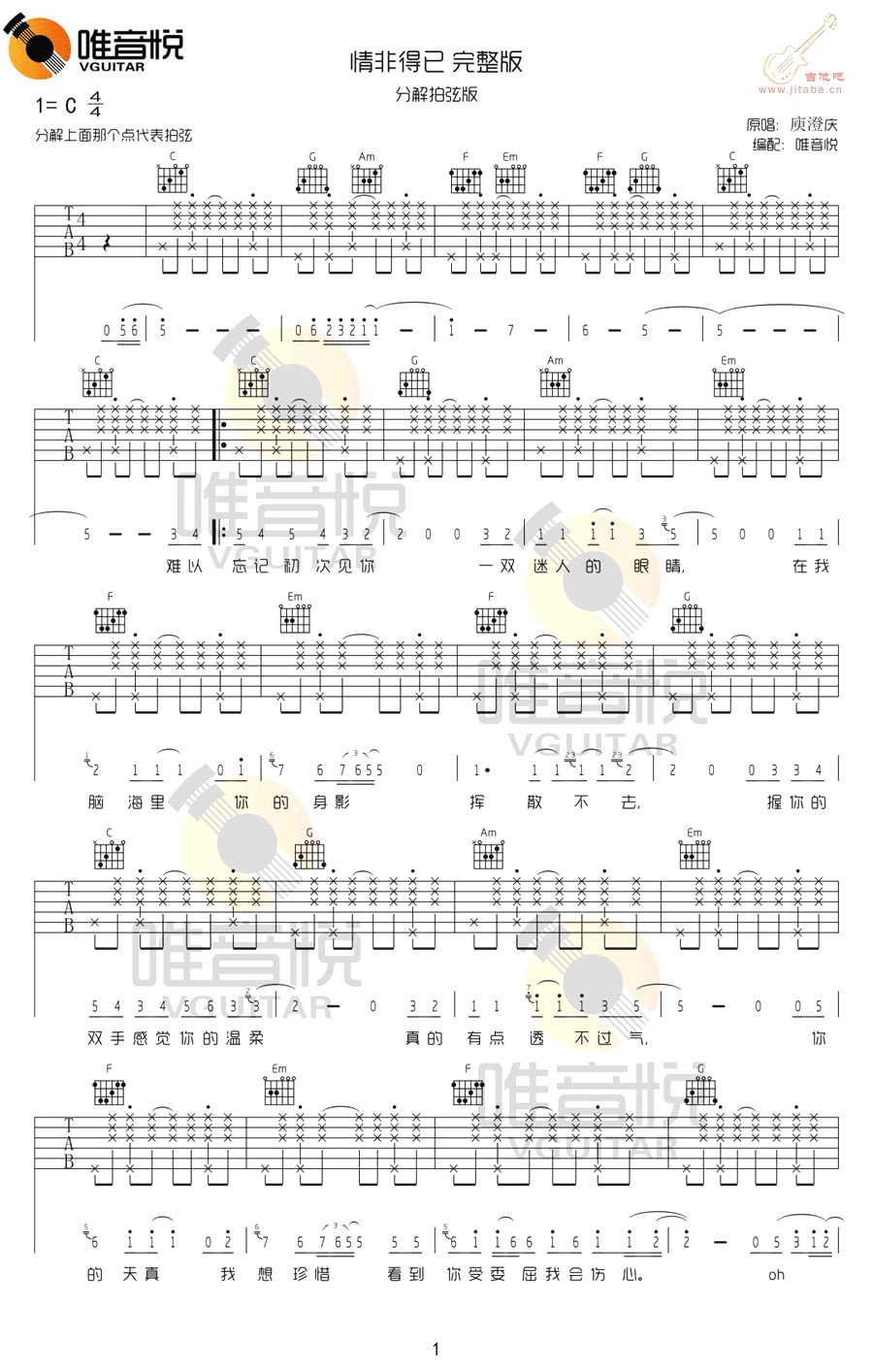 曲谱介绍: 庾澄庆情非得已吉他谱拍弦版,C调指法,情非得已分解拍弦编配完整版,分解上面那个点代表拍弦,高清图片谱共四张谱子。本曲谱根据原版编配,歌曲前奏、间奏和结束给编配好了,还有中间的solo。琴友们可以收藏练习,感谢唯音悦分享。