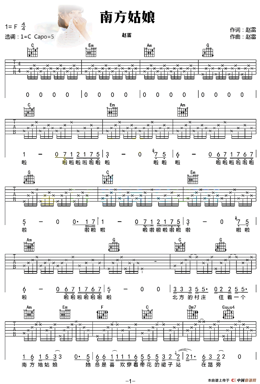 曲谱介绍: 南方姑娘吉他谱,原调F选调C,变调夹夹5品。南方姑娘吉他弹唱谱,图片谱例共四张,六线谱编配完整版。朴素悠扬的旋律,弥漫淡淡哀愁的歌词,在诉说着属于我们的故事,民谣就是能用一把吉他和几句简单的唱词带我们的思绪飘向远方,雷子的声音是沧桑、创作在路上。赵雷民谣歌曲谱收藏。