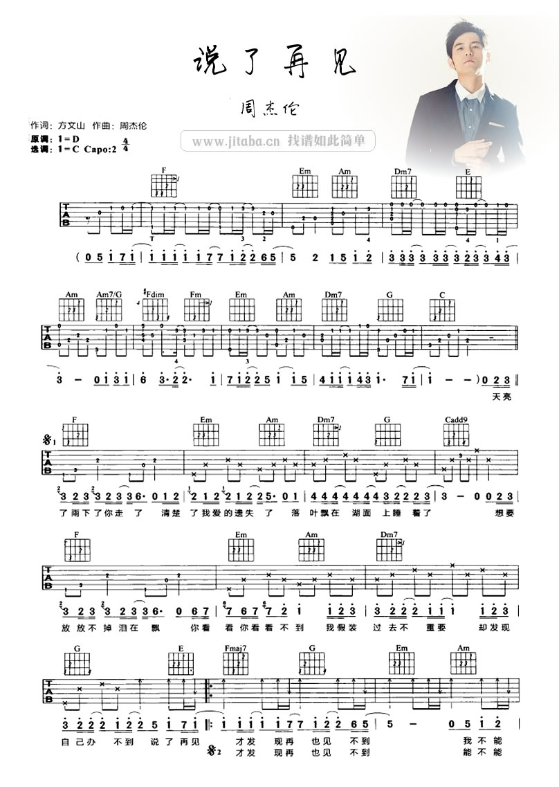 曲谱介绍: 周杰伦说了再见吉他谱,原调D选调C,变调夹Capo夹2品。说了再见吉他弹唱谱,六线谱图片格式,两张谱例。一首舒缓温婉的歌曲 “再见,其实不是告别,而是是承诺” 我们和多少人说了再见,却是再也没见过。这首歌有种伤心的回忆,每次循环到这首歌时,眼泪总是不自觉落下。有时真的非常想回到从前的生活。周杰伦歌曲谱收藏整理。