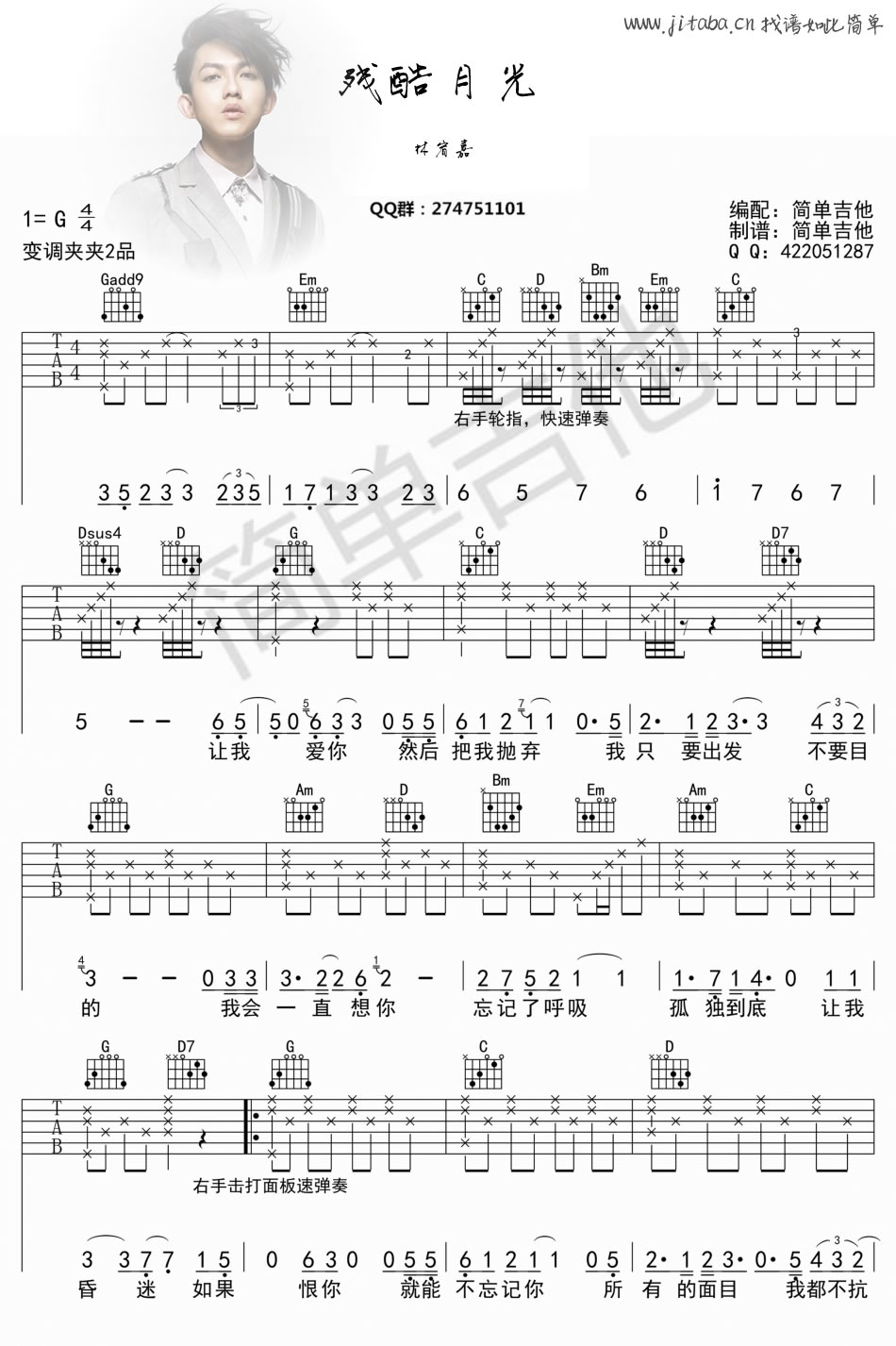 曲谱介绍: 林宥嘉残酷月光吉他谱,变调夹夹第二品。残酷月光吉他弹唱谱,六线谱编配高清图片谱,共两张谱例。感谢简单吉他编配分享。寂寞伤感的声音,轻轻的话语如泣如诉,深情和真切格外触动心弦。林宥嘉歌曲谱收藏。