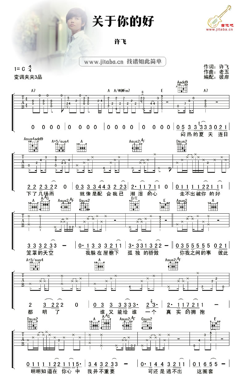 曲谱介绍: 许飞关于你的好吉他谱,变调夹夹三品,关于你的好吉他弹唱谱,图片格式。关于许飞,就想到那抱着吉他唱着歌的样子。淡淡的歌、淡淡的旋律,清新舒服,你给的温柔谁也代替不了。清爽系情歌《关于你的好》吉他六线谱,许飞歌曲谱整理收藏。