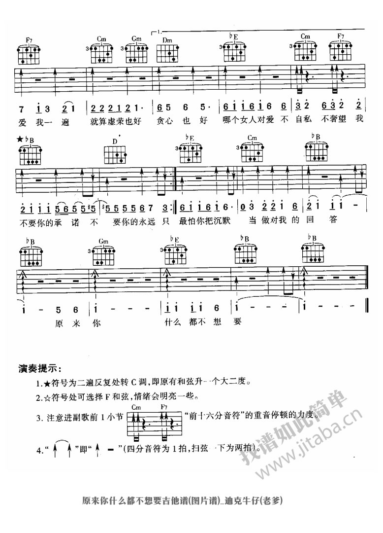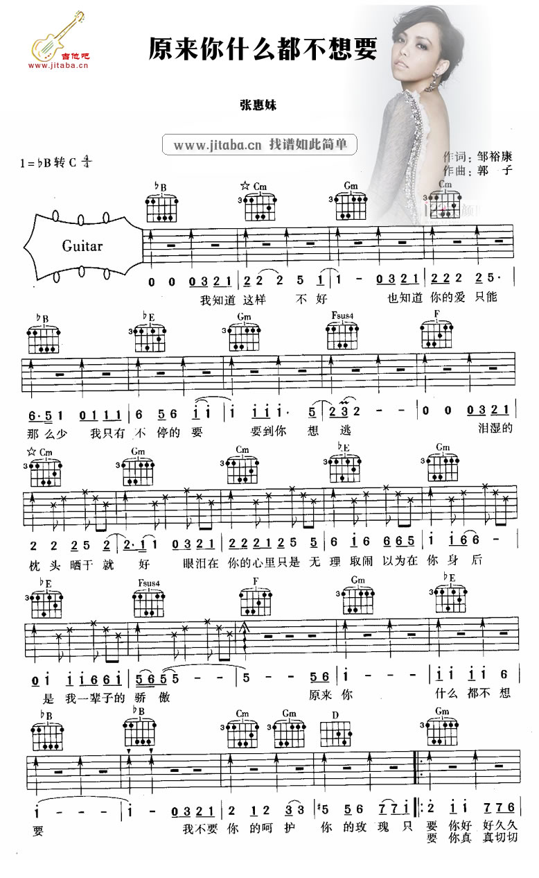 曲谱介绍: 张惠妹原来你什么都不想要吉他谱,曲谱为六线谱编配版本,演奏提示参看图片谱下方说明。张惠妹的经典情歌《原来你什么都不要》吉他弹唱谱,迪克牛仔翻唱演绎男声版也有特色。