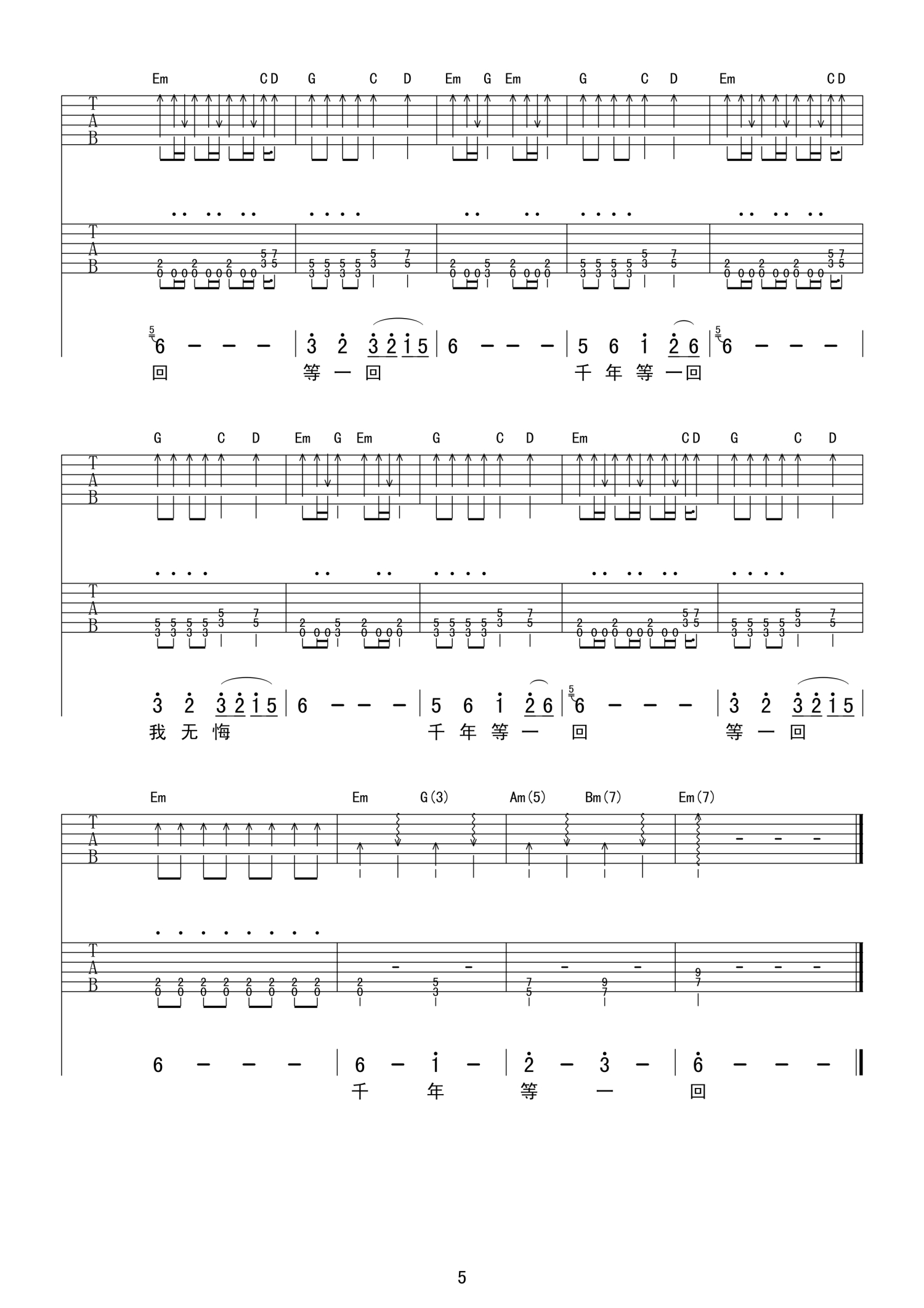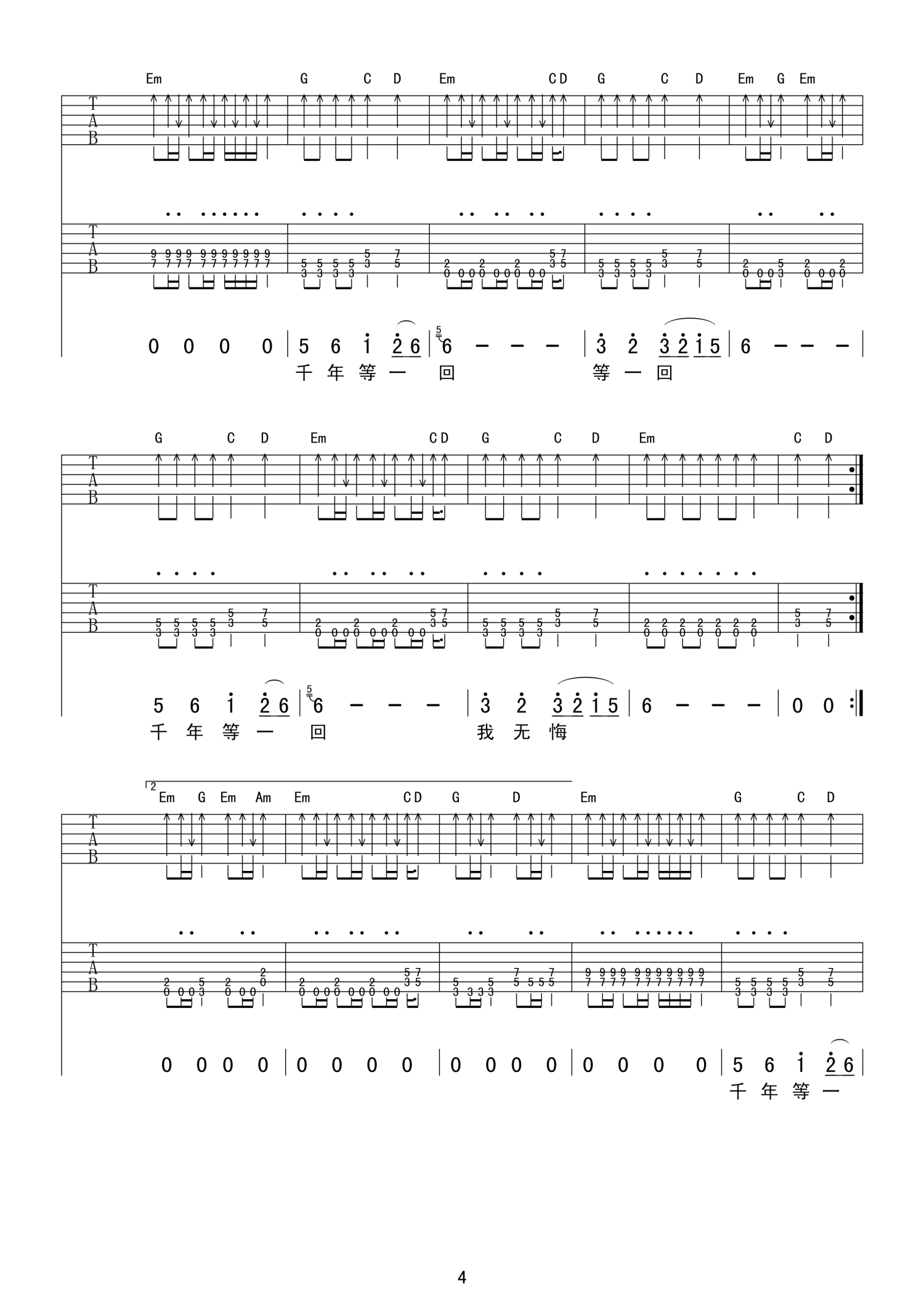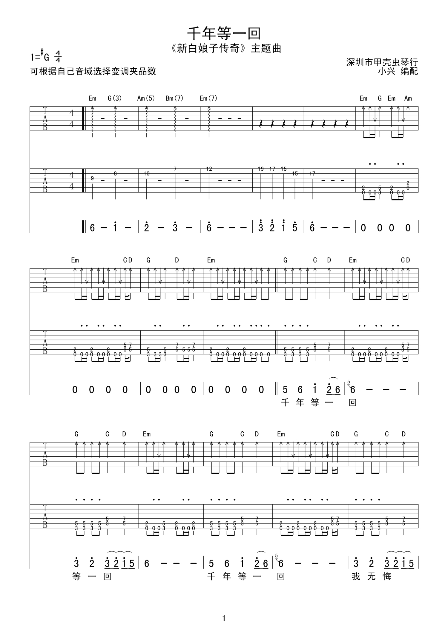 曲谱介绍: 千年等一回吉他谱   新白娘子传奇主题曲,琴友们可根据自己音域选择变调夹品数进行弹唱练习。千年等一回吉他谱,双吉他版本