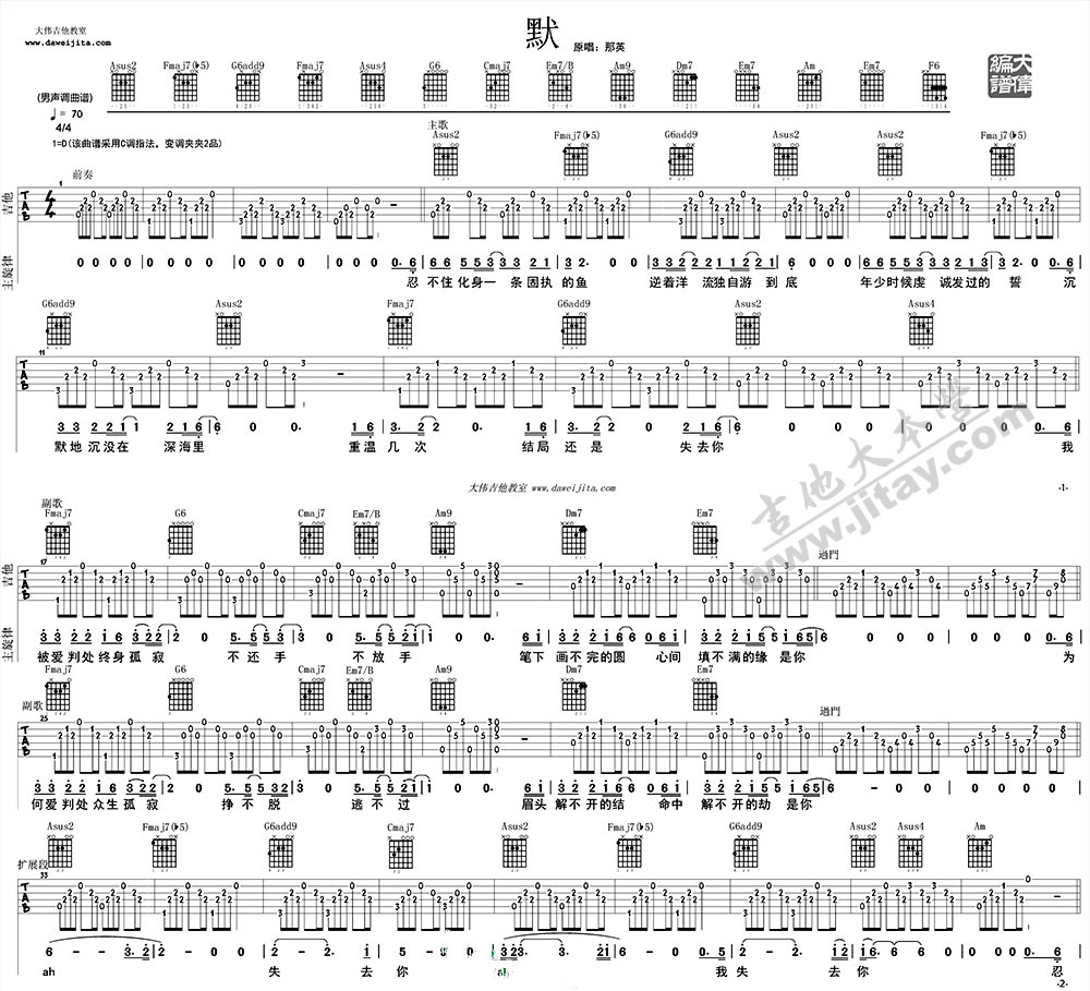 曲谱介绍: 那英默六线谱,图片谱格式。男声调曲谱编配,原调D,曲谱采用C调指法,变调夹夹第二品。这首歌曲是电影《何以笙箫默》主题曲,周杰伦在中国好声音节目演绎了这首《默》,也给人留下了深刻印象。