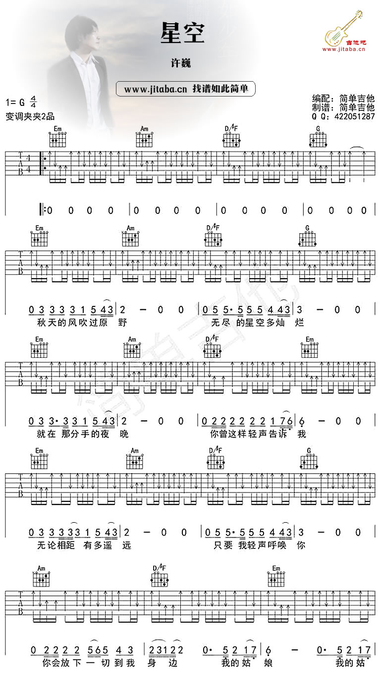 曲谱介绍: 许巍星空吉他谱,原调G调,变调夹夹第二品,新手入门版编配。星空吉他弹唱谱简单版,六线谱两张图片谱例。柔软的旋律,动心的歌词。或许能治愈我的失眠,我的失恋。音乐是最美好的表达方式,能唱出来的心声也是最动听。爱听音乐,不仅仅是因为歌曲美妙的旋律,而是总有一首歌可以唱出我们最真挚的心声。“也不在乎它的真假,只是将你轻轻拥在我怀里,仰望着蓝色的星空。\"许巍《星空》歌曲谱推荐。
