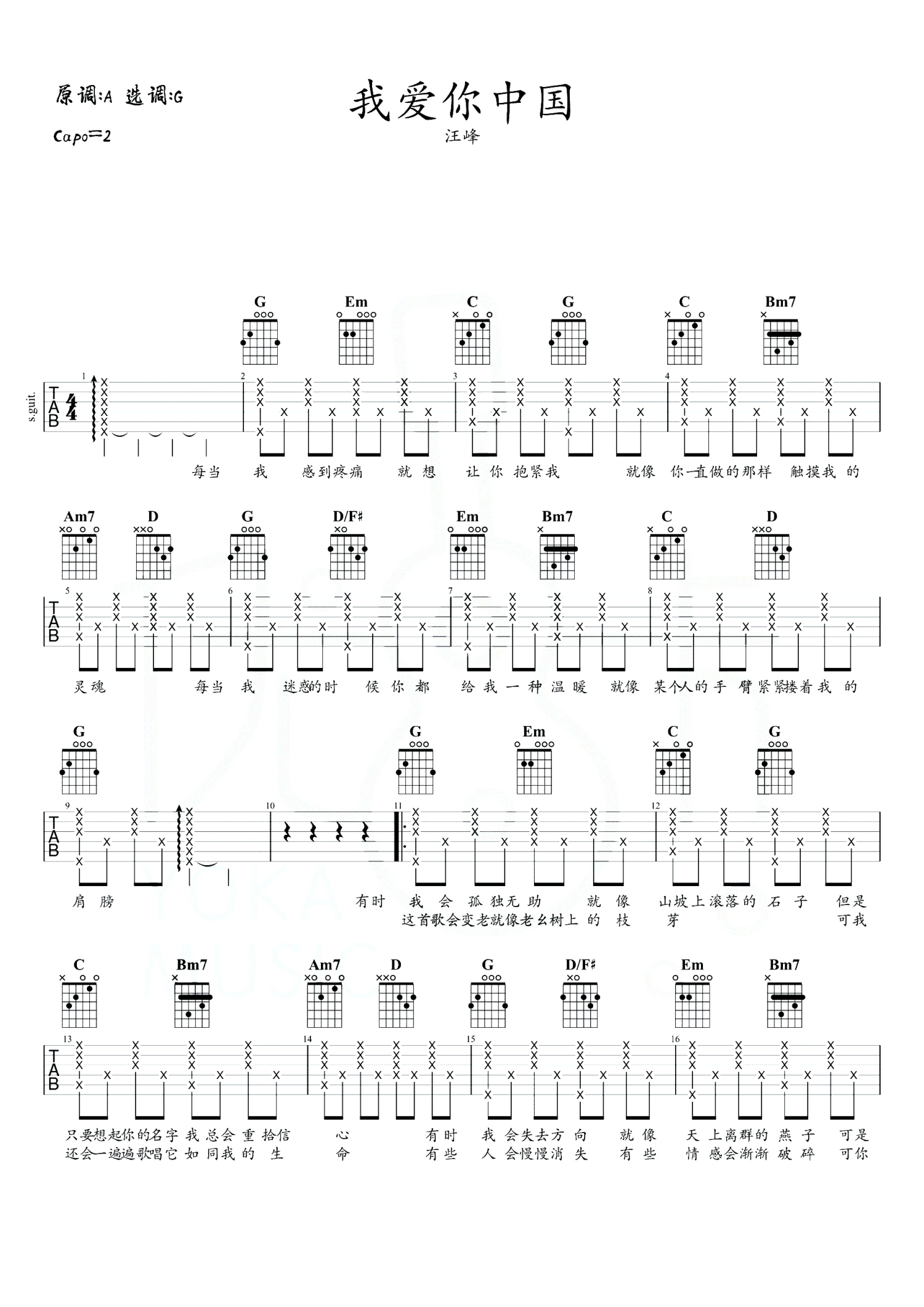 我爱你中国吉他谱 - 汪峰 - G调吉他弹唱谱