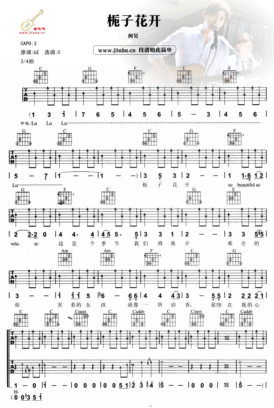 曲谱介绍: 何炅栀子花开吉他谱,六线谱编配,原调降E调,变调夹夹第三品,选用C调指法。电影《栀子花开》热映,很大一部分人去看不仅仅是为了李易峰的颜值,而是是怀念何老师很多年前那首唱遍街头巷尾的“栀子花开呀开”,去感受栀子花带给我们的清香和那淡淡的青春、纯纯的爱。栀子花开在了多少人的心里,歌词很简单,但是旋律永远动人。栀子花开,许诺一生。
