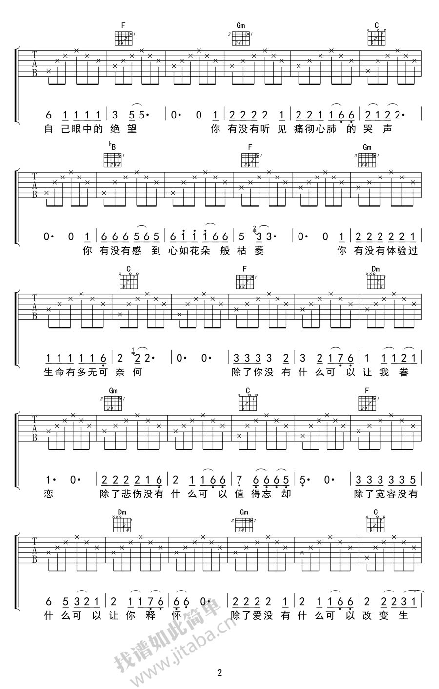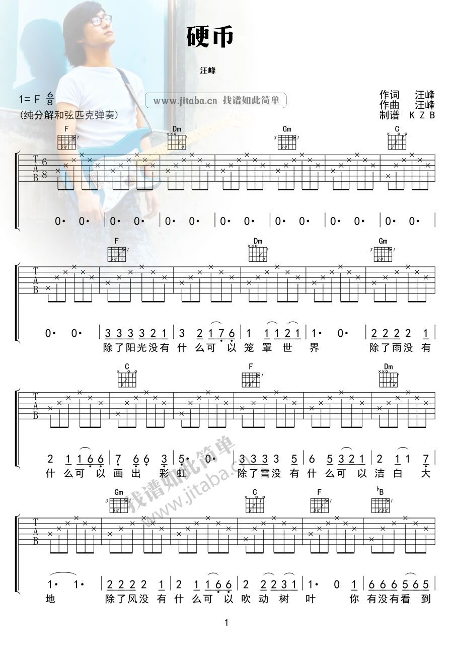 曲谱介绍: 汪峰硬币吉他谱,硬币六线谱编配,F调指法,纯分解和弦匹克弹奏。硬币吉他弹唱谱,舒缓的旋律美丽、忧伤但却不绝望,娓娓诉说着一个经历过爱恨悲喜的男人的情怀,让人感觉很真实。除了雨没有什么可以画出彩虹,我们真的要学会宽容,学会去爱,惟有这样我们的生命才不会枯萎,才不会感到无可奈何。
