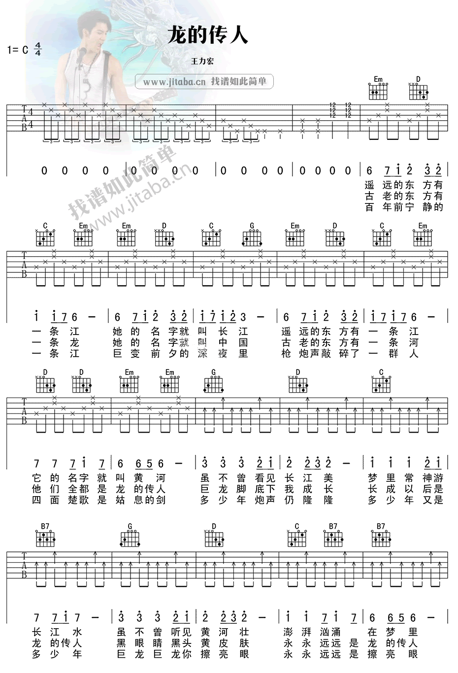 曲谱介绍: 王力宏龙的传人吉他谱,C调和弦编配,龙的传人六线谱,高清图片谱。这首歌的原唱是李建复,无论是在国外还是国内 只要一响起《龙的传人》的旋律 就会让所有的炎黄子孙热血沸腾。王力宏歌曲吉他弹唱《龙的传人》吉他谱。