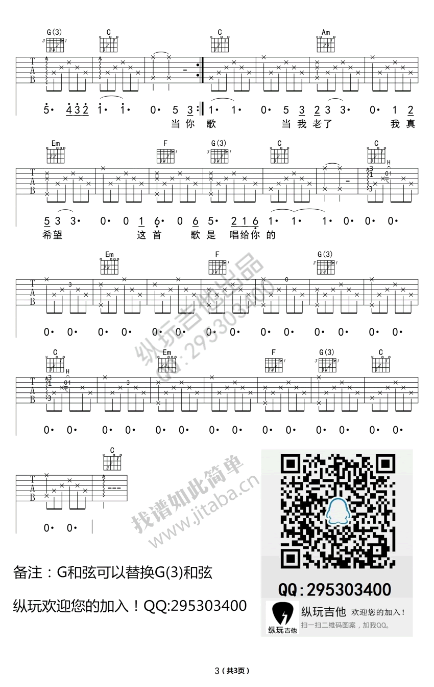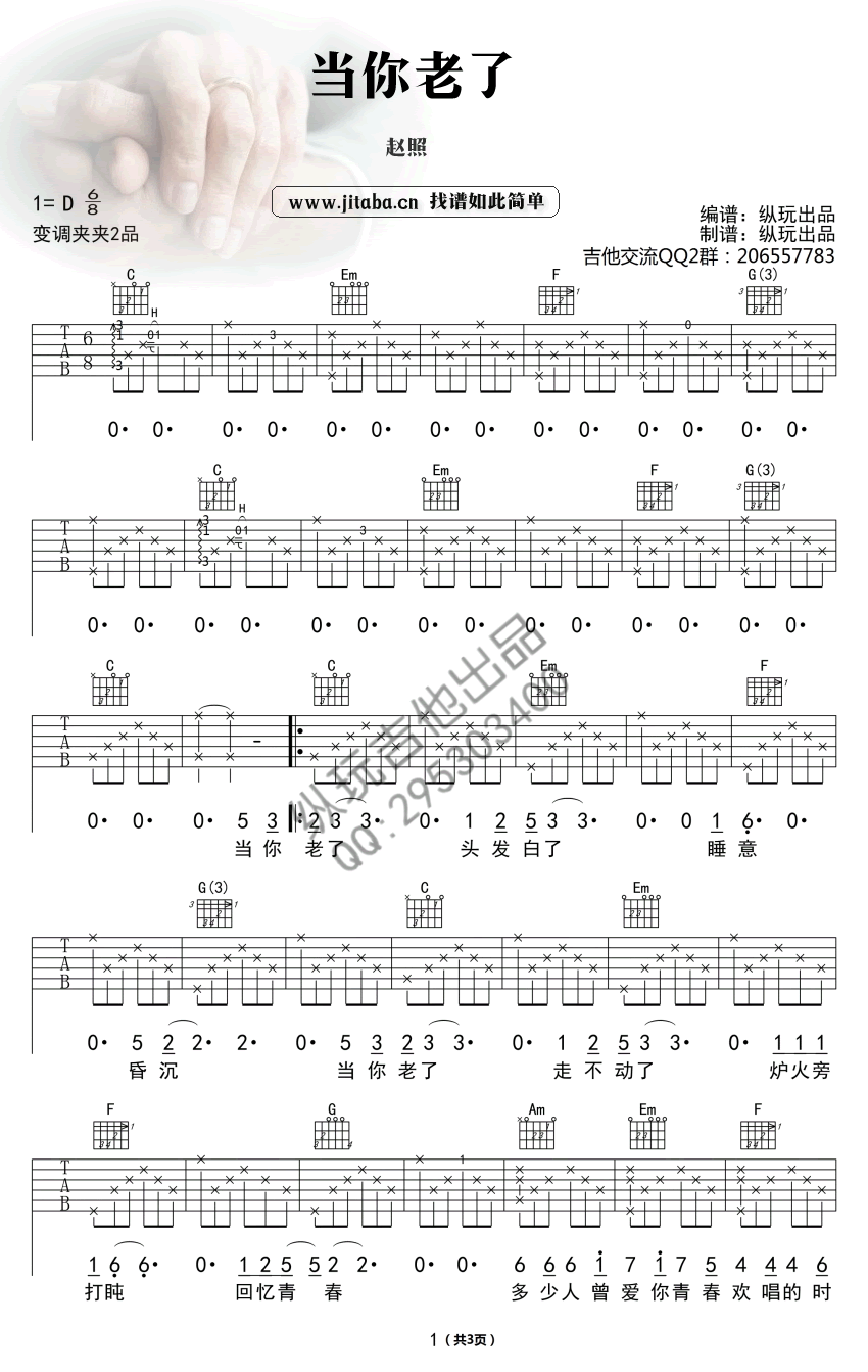 曲谱介绍: 当你老了吉他谱,变调夹夹第二品,G和弦可以替代G3和弦,当你老了六线谱图片高清版。爱尔兰诗人叶芝的同名诗作改编而成,不论诗歌或是歌曲,这些流淌过心上的词句和旋律,总能唤起我们的某种情怀。当岁月带走青春年华,是否有一曲心语涟漪成为永恒?赵照好听的民谣歌曲,当你老了吉他弹唱谱。