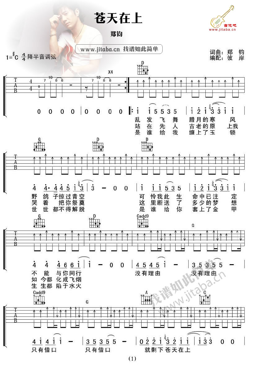 曲谱介绍: 郑钧苍天在上吉他谱,#C调降半音调弦,苍天在上六线谱,两张图片谱。这首歌的旋律并不是很出色,但歌词的后部却很好,它道出了一种许多人想言而难言的爱情状态与痛苦,探及人的灵魂深处,言简而意不简。苍天在上吉他弹唱谱,郑钧歌曲谱收藏。