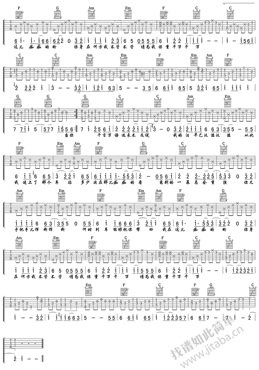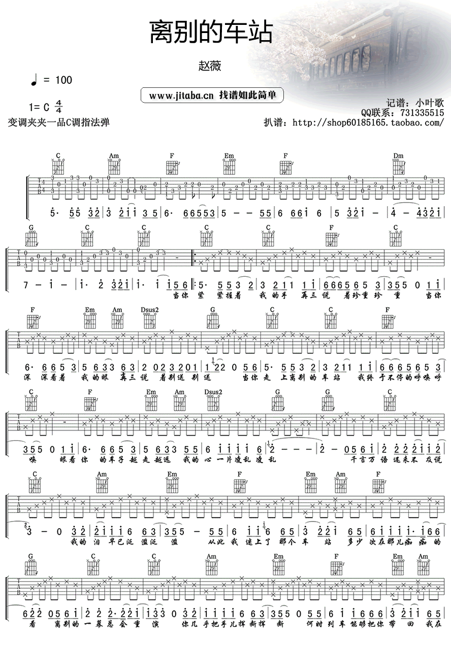 曲谱介绍: 赵薇离别的车站吉他谱,变调夹夹第一品,采用C调指法。离别的车站吉他弹唱谱,六线谱图片。琼瑶剧《情深深雨濛濛》插曲。一聚一离别,一喜一伤悲。离别被眼泪浸湿,溢出悲伤的色彩,而谁又能想到:离别也美丽。离别后虽然有等待,也是为了下次更美好的相遇…