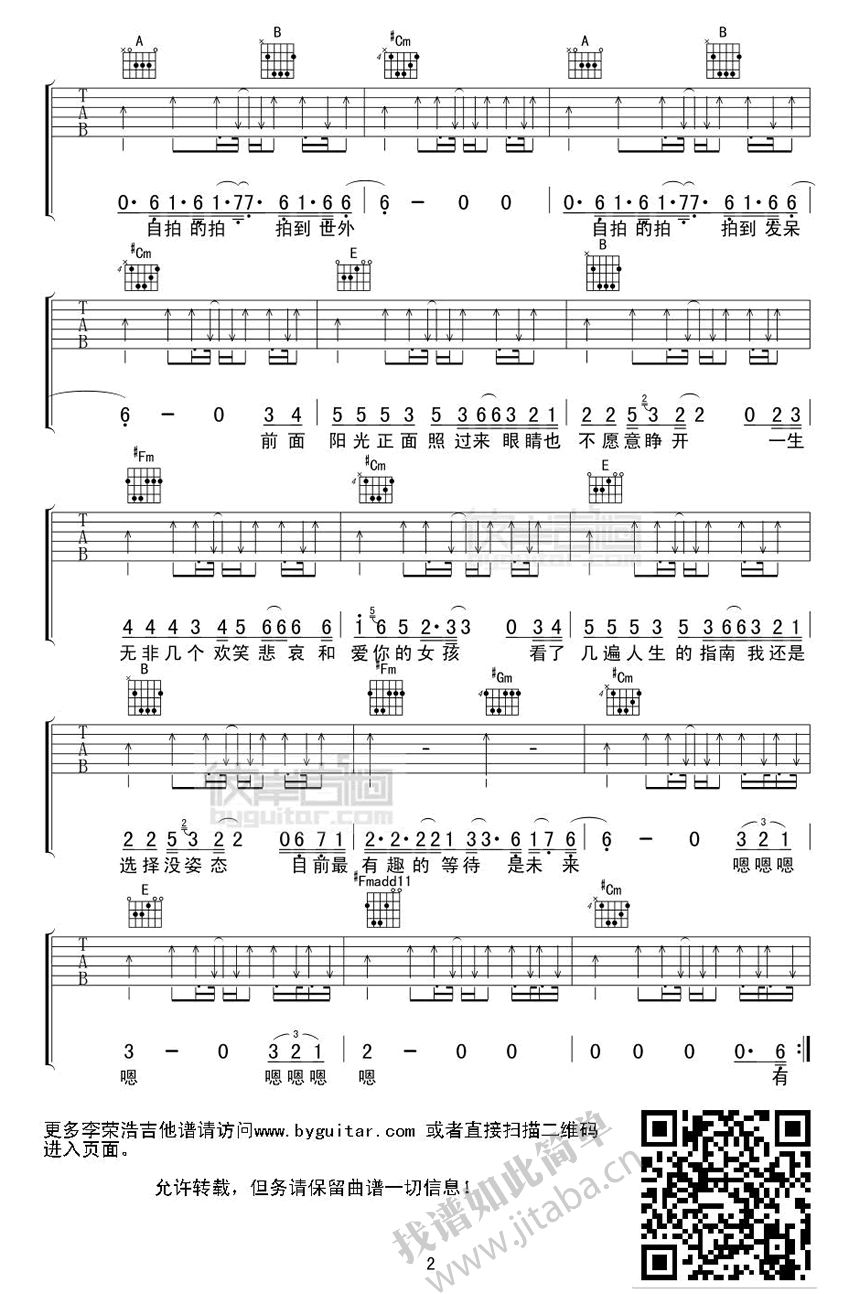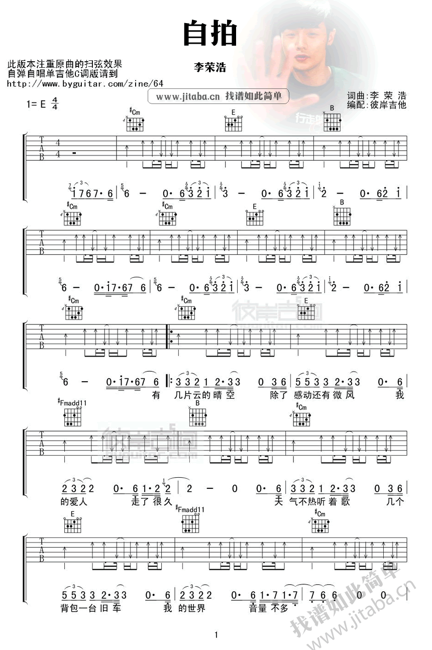 曲谱介绍: 李荣浩自拍吉他谱,本曲谱注重原曲的扫弦效果。慵懒的歌声搭配吉他的简单旋律,不由自主的想象着午后微风吹落的叶芽儿在时光缝隙里忽闪忽闪,自拍吉他图片谱,李荣浩歌曲谱收藏整理。