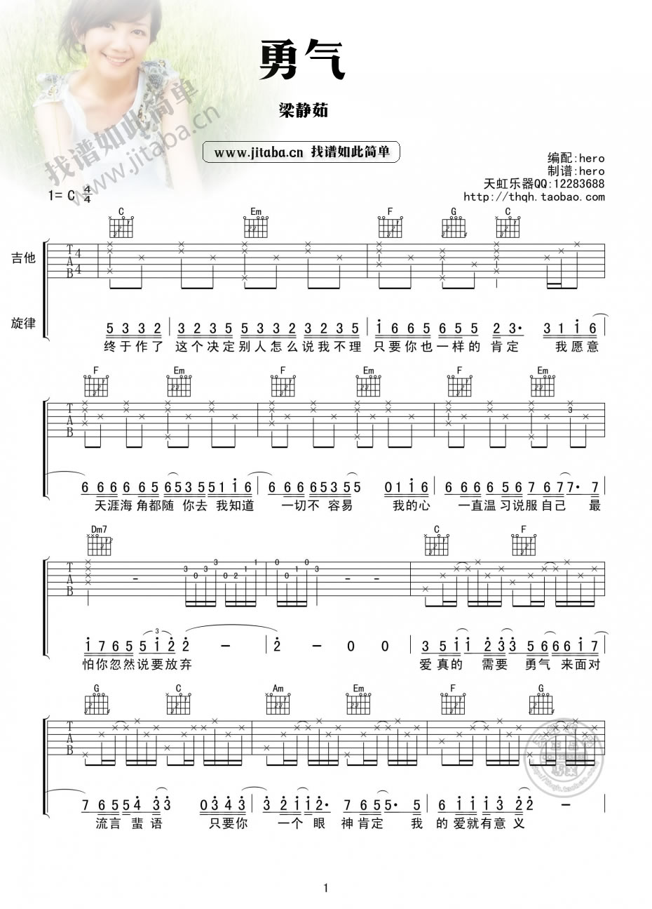 曲谱介绍: 梁静茹勇气吉他谱,C调指法编配,勇气吉他弹唱谱,高清图片谱。心情好时听歌,哼的是旋律,低落时听的是歌词,字字入心入肺,歌曲诠释了为爱向前的勇气,91吉他谱推荐梁静茹的这首经典情歌,感谢岁月恩慈,把十几岁的青春时光偷留了一点存在歌里,每当旋律响起,就让我们重新回到过去。