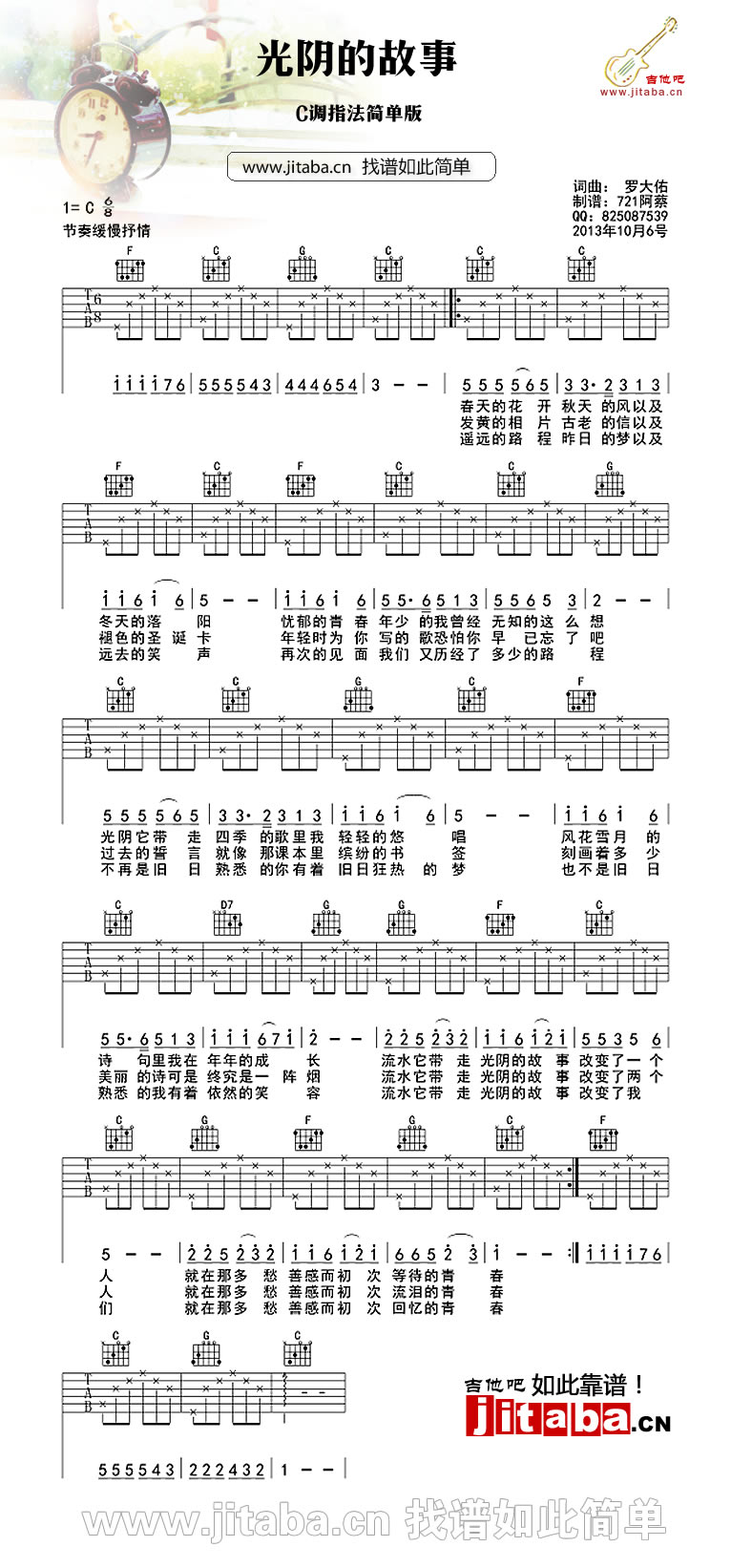 曲谱介绍: 罗大佑 光阴的故事吉他谱,C调指法编配,光阴的故事简单版吉他谱,节奏缓慢抒情。