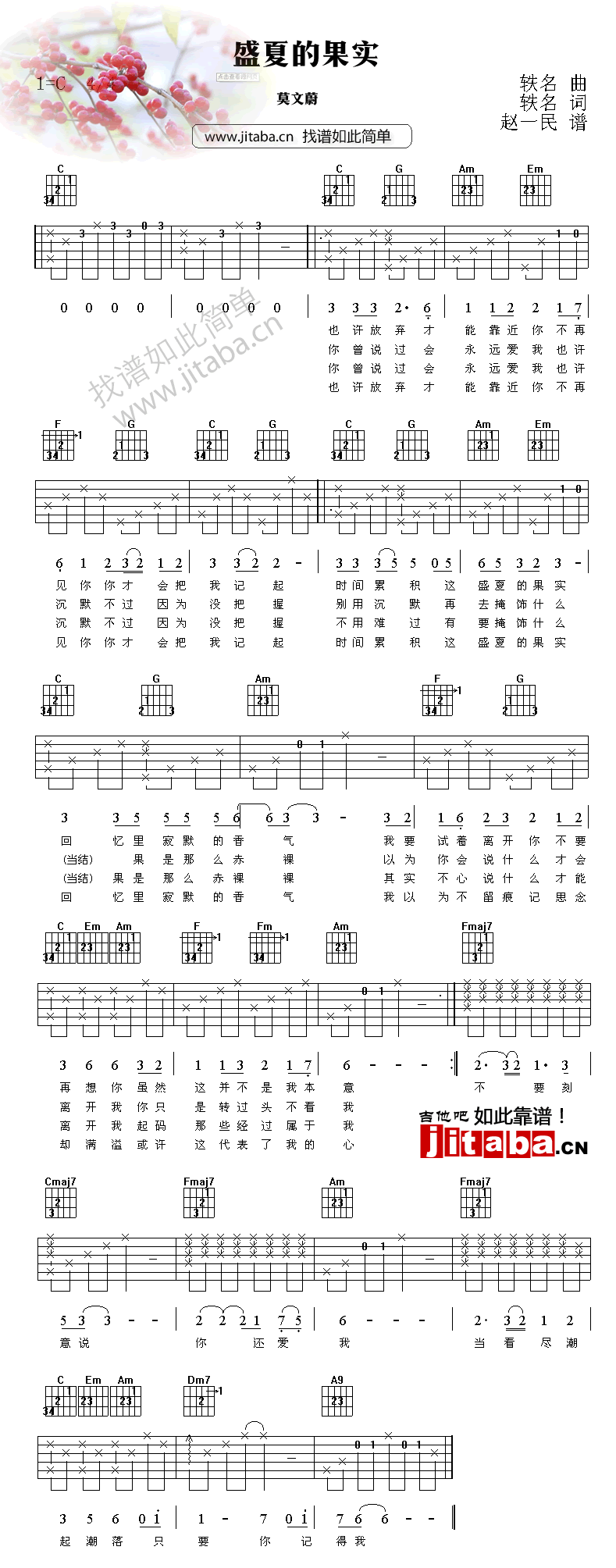 曲谱介绍: 盛夏的果实吉他谱,图片谱格式,莫文蔚代表歌曲,盛夏的果实是一首经典佳作KTV必点曲目。虽然是很多年前的老歌,现在听起来还是别有一番风味。91吉他谱网站推荐。