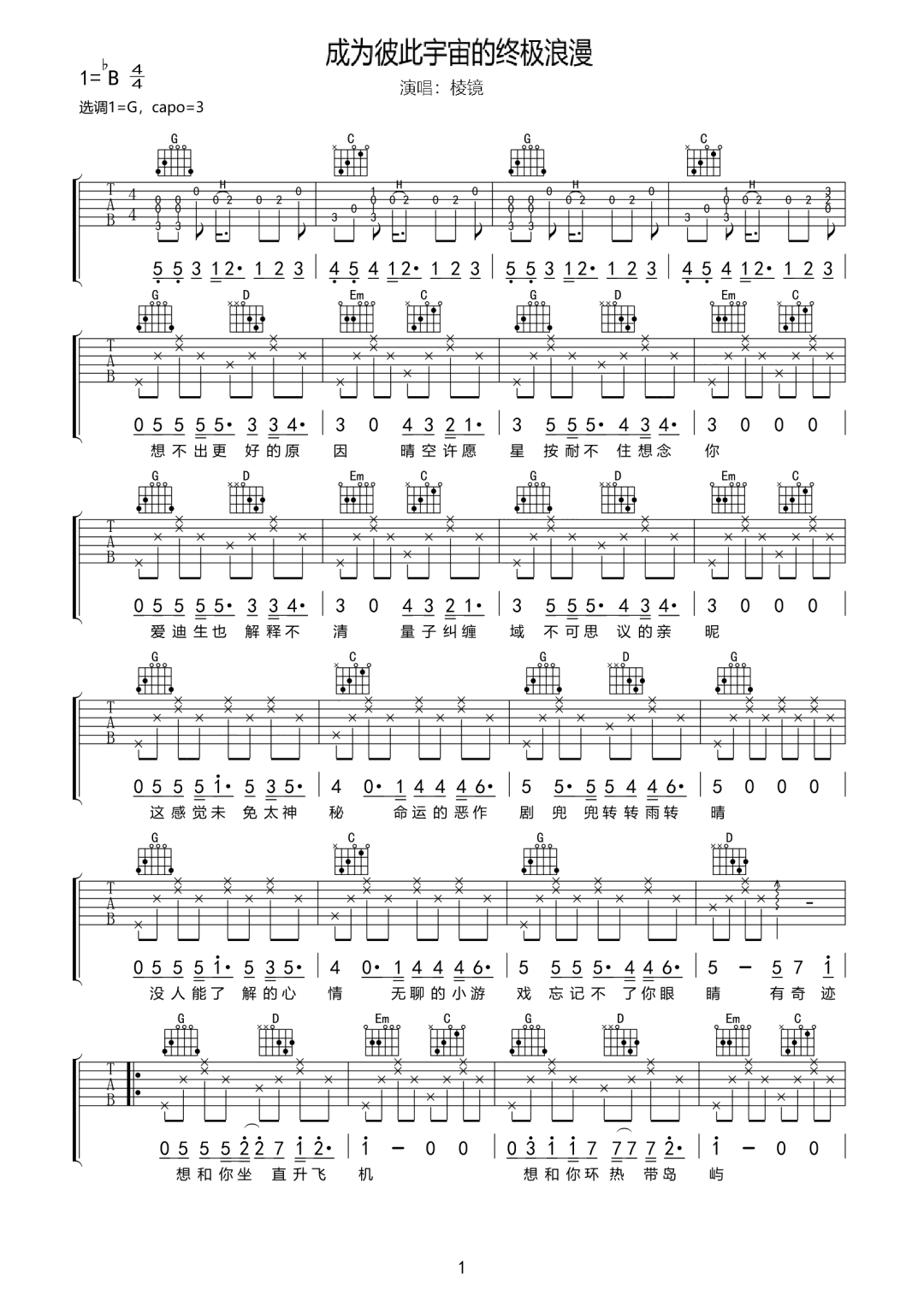 曲谱介绍: 吉他谱介绍:成为彼此宇宙的终极浪漫吉他谱,棱镜乐队演唱的一首歌曲,4/4拍的节奏,这首歌曲的原调为降B调,这里曲谱采用了G调指法进行编配,演唱时夹变调夹3品可回到原调,也可根据个人实际嗓音情况选择。曲谱由琴谱网更新上传,共3张高清图片弹唱吉他谱例,曲谱来源于网络转载,编配制谱者暂不详。棱镜,记录所有人认真生活过的世界。 流动音阶组合纯粹词句,以真诚口吻表达真切情感。无关风格,无关悲喜,皆是这个时代里最真实的情绪,是平凡生活的伟大意义。