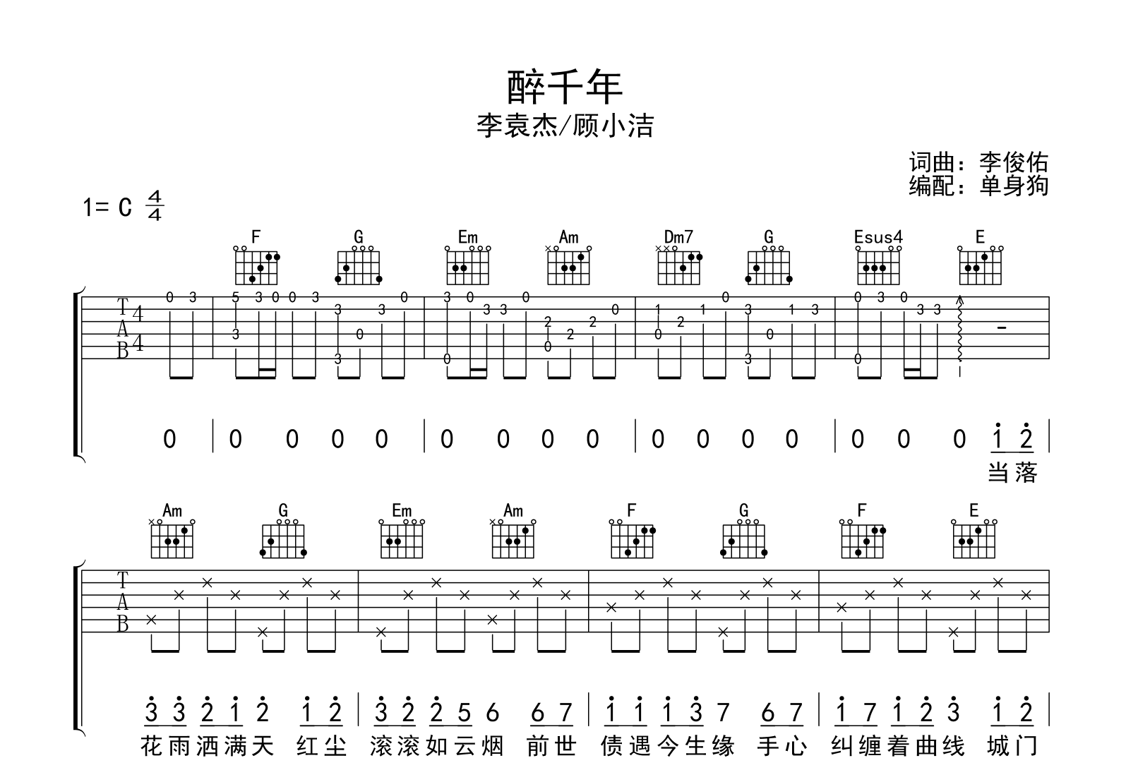 醉千年吉他谱 - 李袁杰/顾小洁 - C调吉他弹唱谱