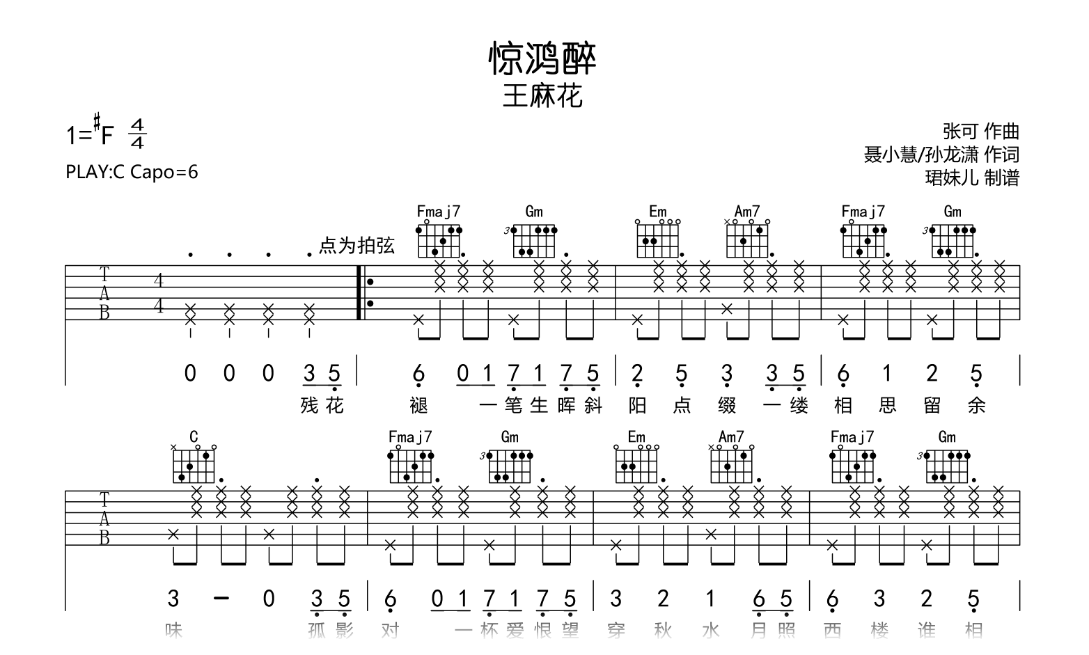 曲谱介绍: 惊鸿醉吉他谱,王麻花演唱,《惊鸿醉》吉他弹唱谱,原调升F,采用C调指法编配,建议变调夹6品,速度95BPM,难度较简单,演奏易上手,共两张高清图片六线谱。