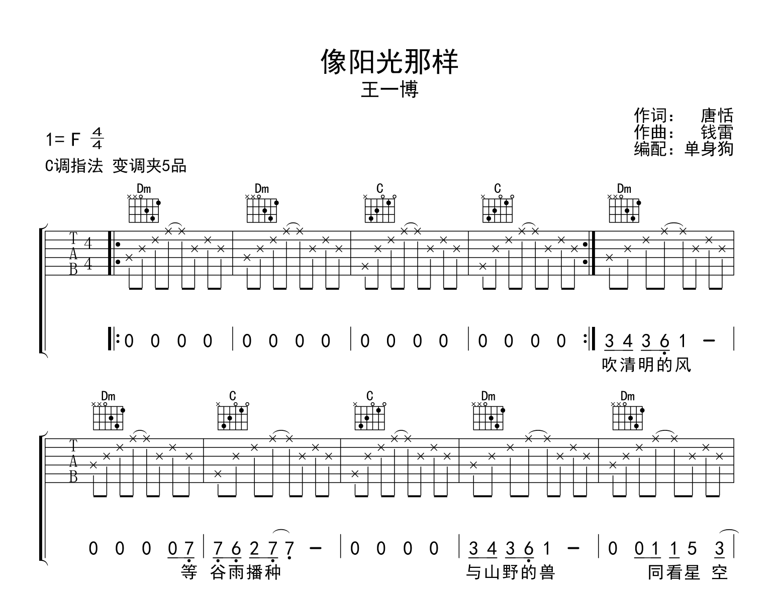 曲谱介绍: 像阳光那样吉他谱,王一博演唱,一首唤醒春天、奔向大自然的歌。《像阳光那样》吉他弹唱谱,原调F调,C调和弦指法编配,变调夹夹五品。高清六线谱共五张图片谱例。