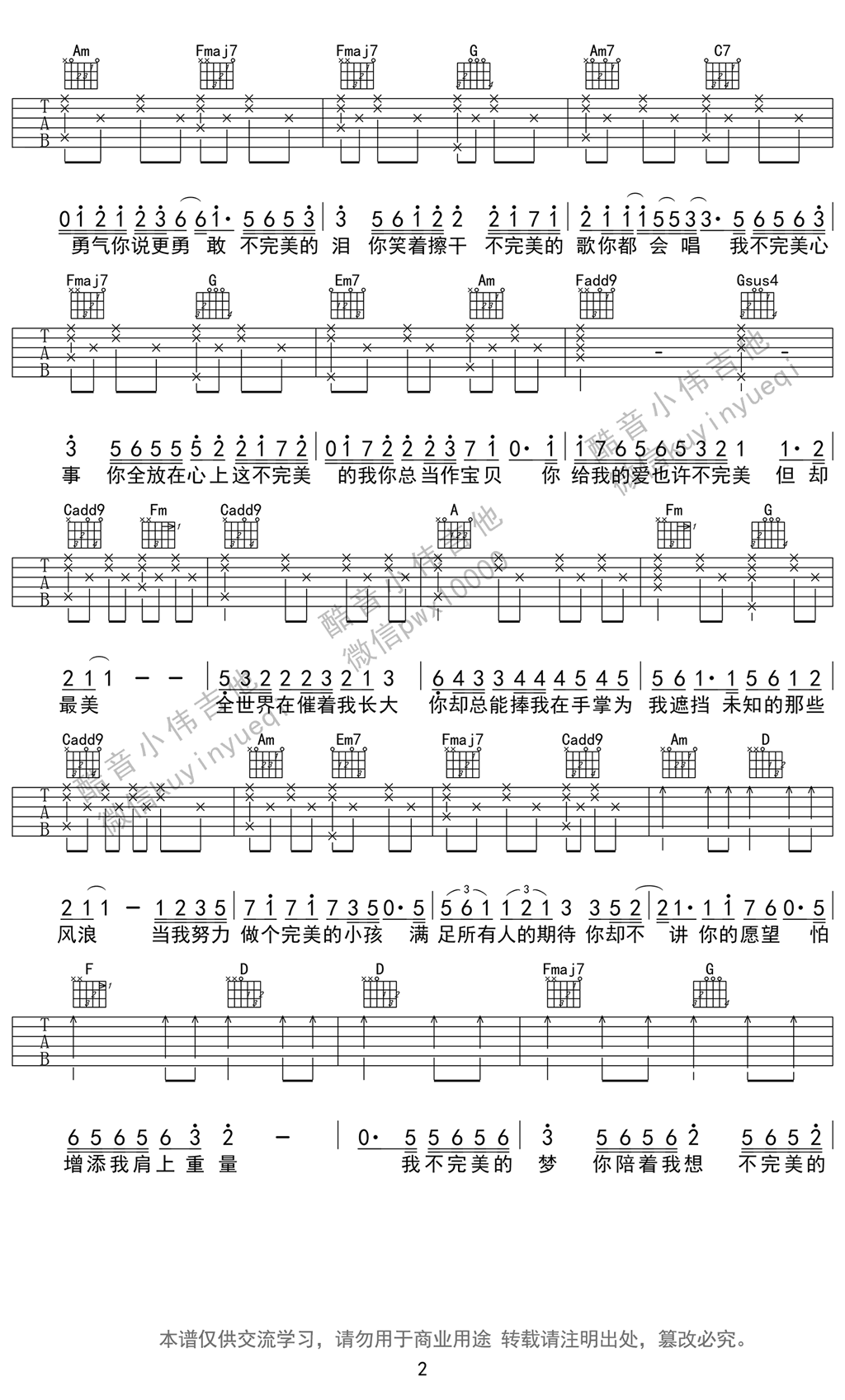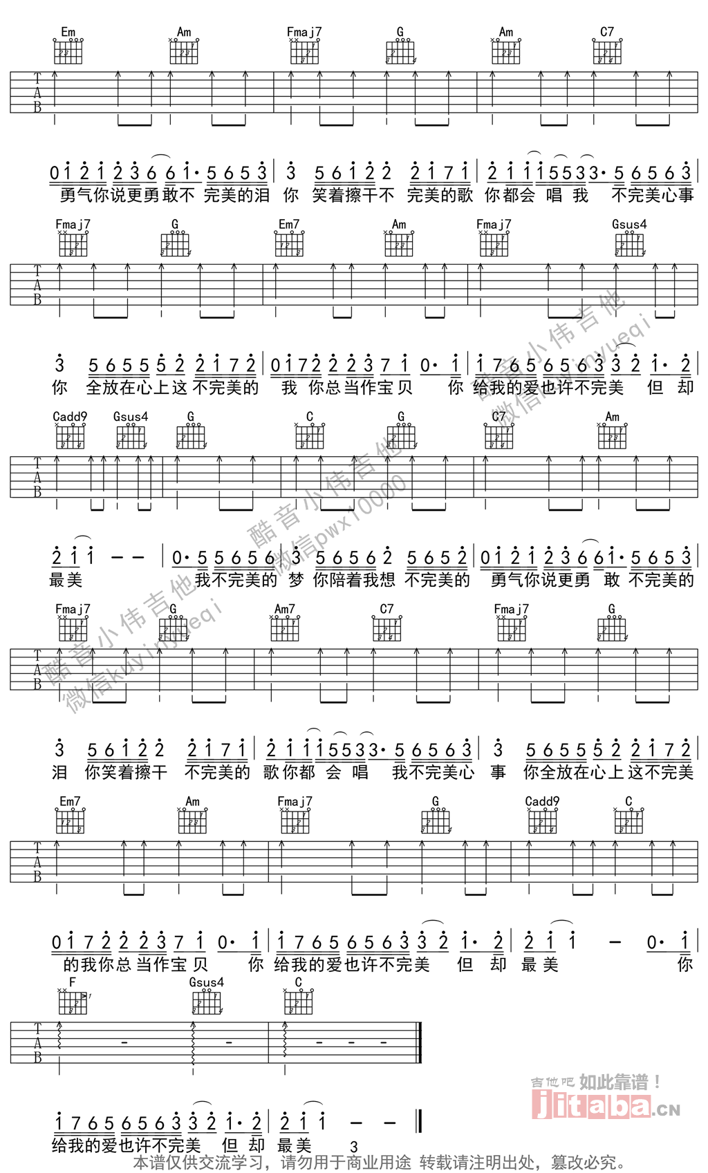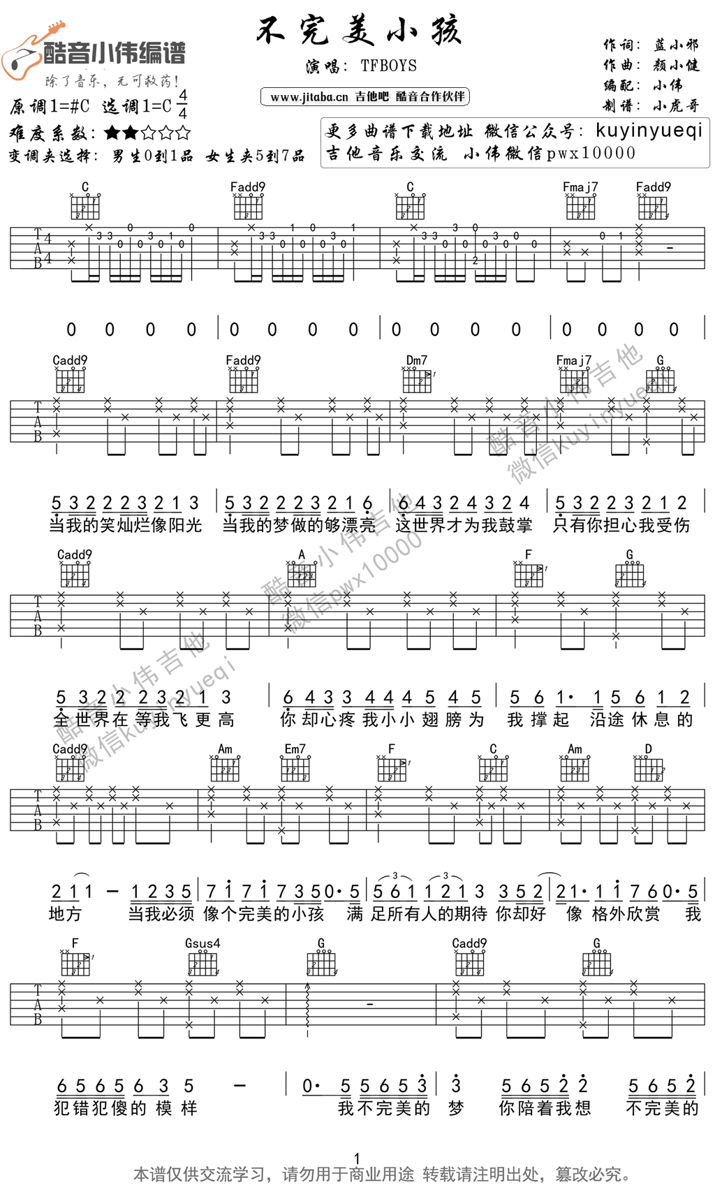 曲谱介绍: TFBOYS不完美小孩吉他谱,新手入门版本,不完美小孩吉他弹唱谱,原调#C,选调C调,难度系数两颗星,变调夹选择,男生0-1品,女生夹5到7品,感谢小伟编配,小虎哥制谱。